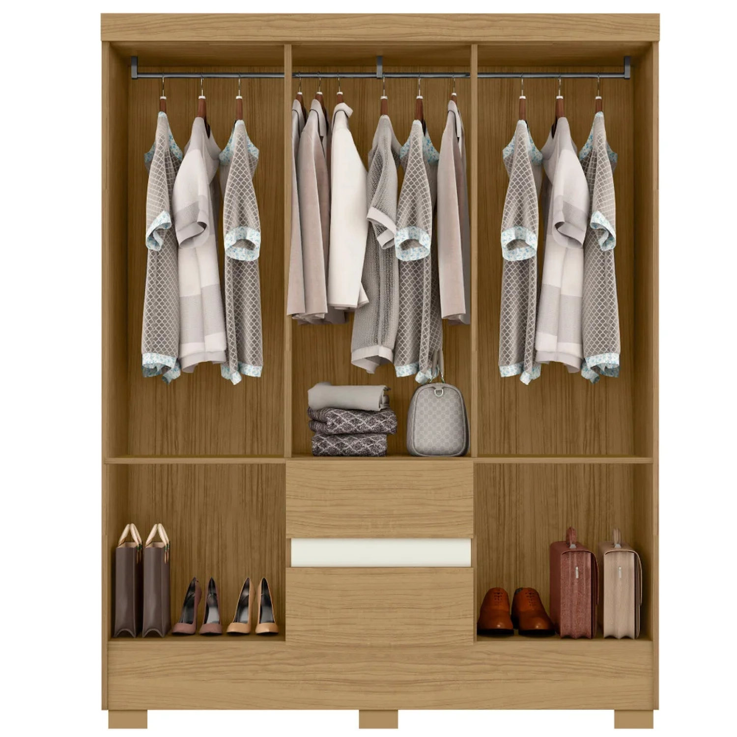 Internamente, possui uma prateleiras bem distribuídas e três cabideiros em madeira revestido em PVC, ideal para manter as roupas sempre bem acomodadas em seu Quarto de Casal.