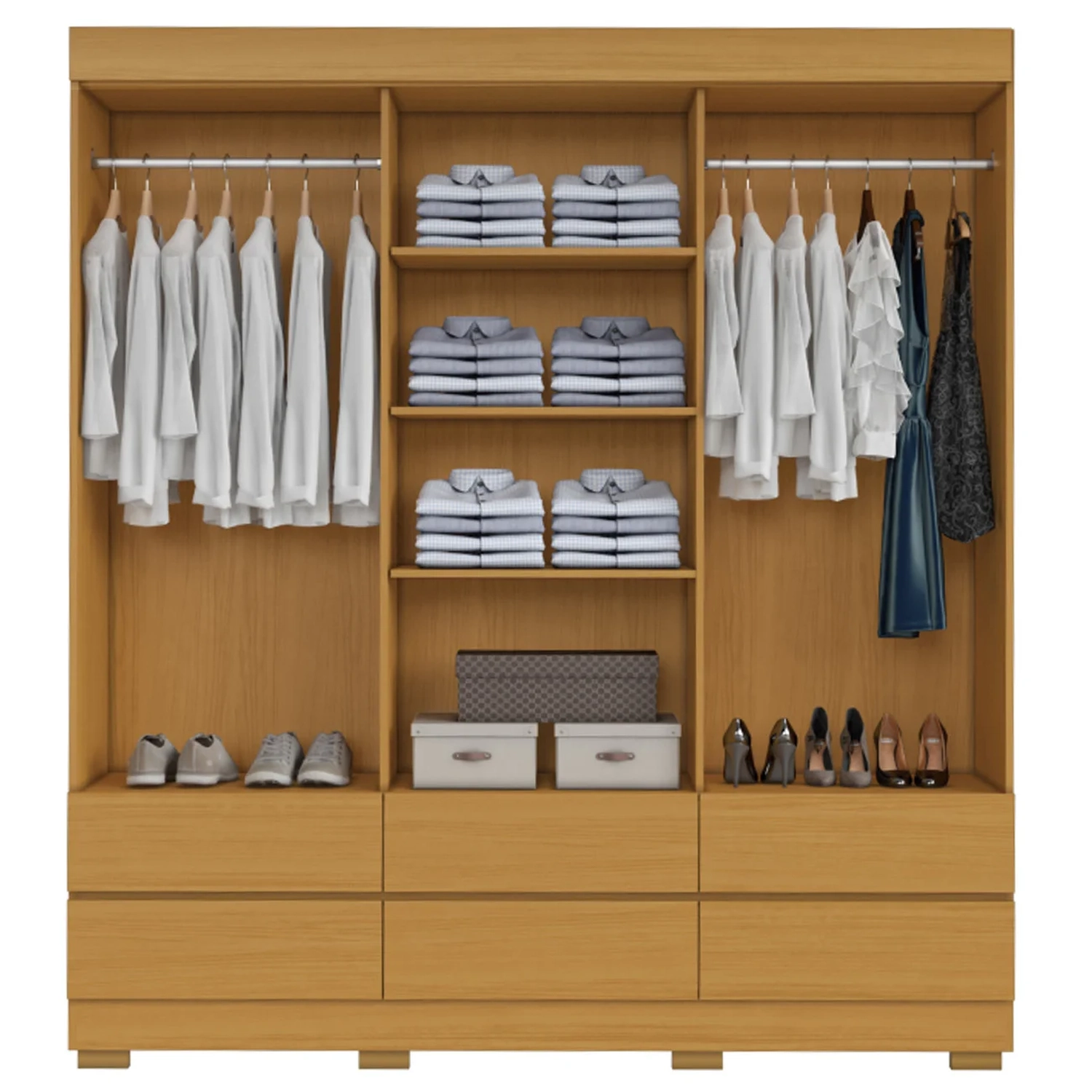 Internamente, são quatro prateleiras bem distribuídas além de dois cabideiros de madeira revestidos, ideais para acomodar roupas dobradas e peças penduradas com praticidade em seu Quarto de Casal.