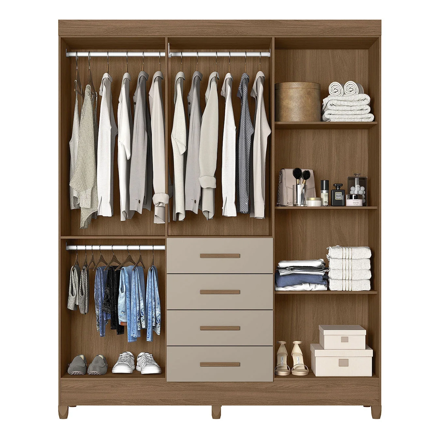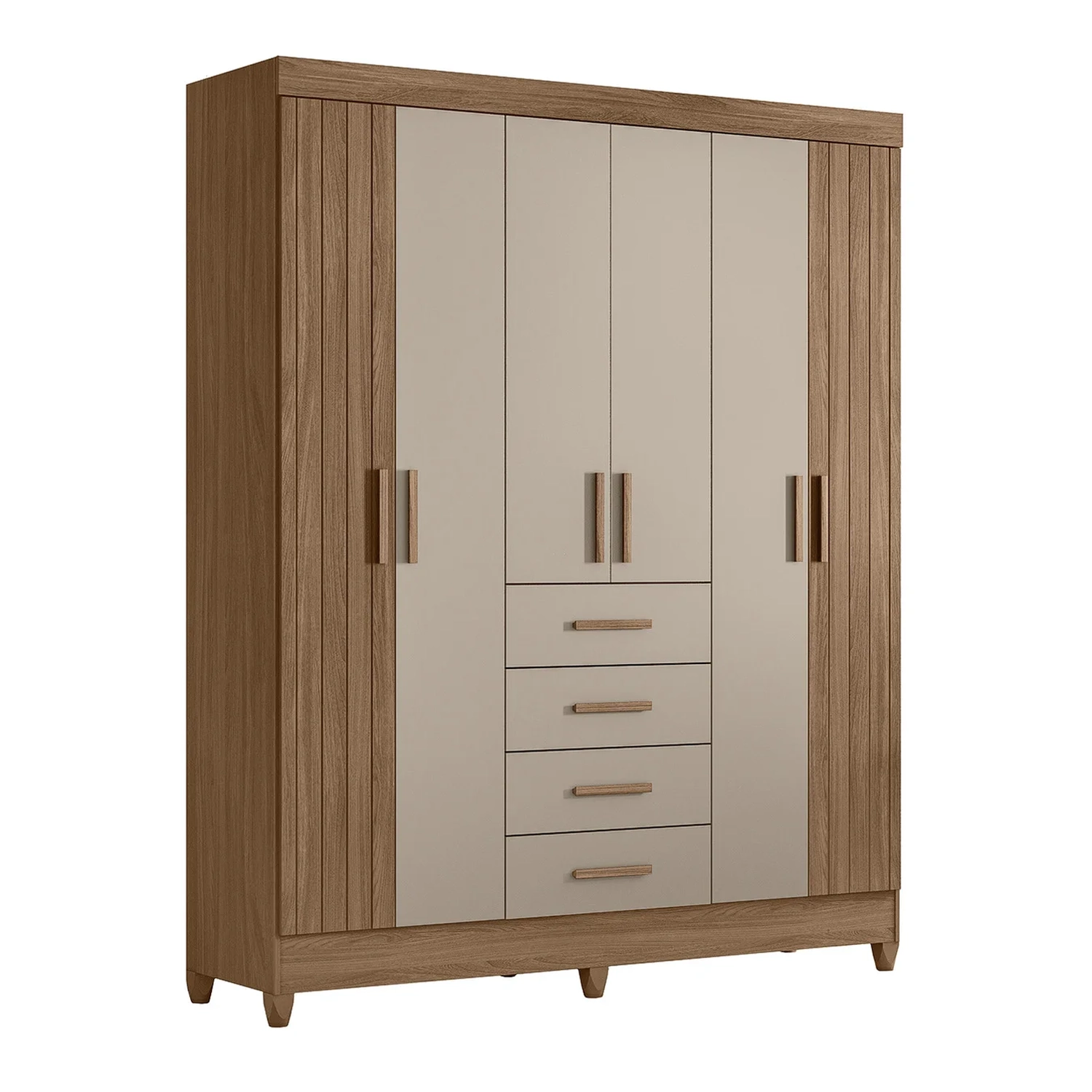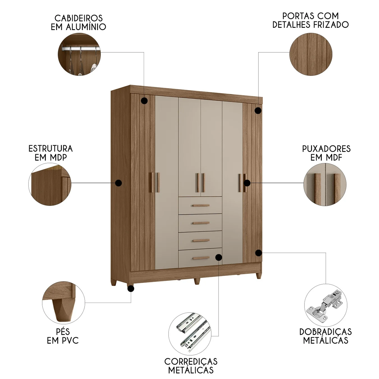 Os puxadores em MDF agregam charme ao design, oferecendo um toque de sofisticação aliado à resistência. Esse Roupeiro é altamente funcional, contando com quatro gavetas com corrediças metálicas que proporcionam abertura total e suave.
