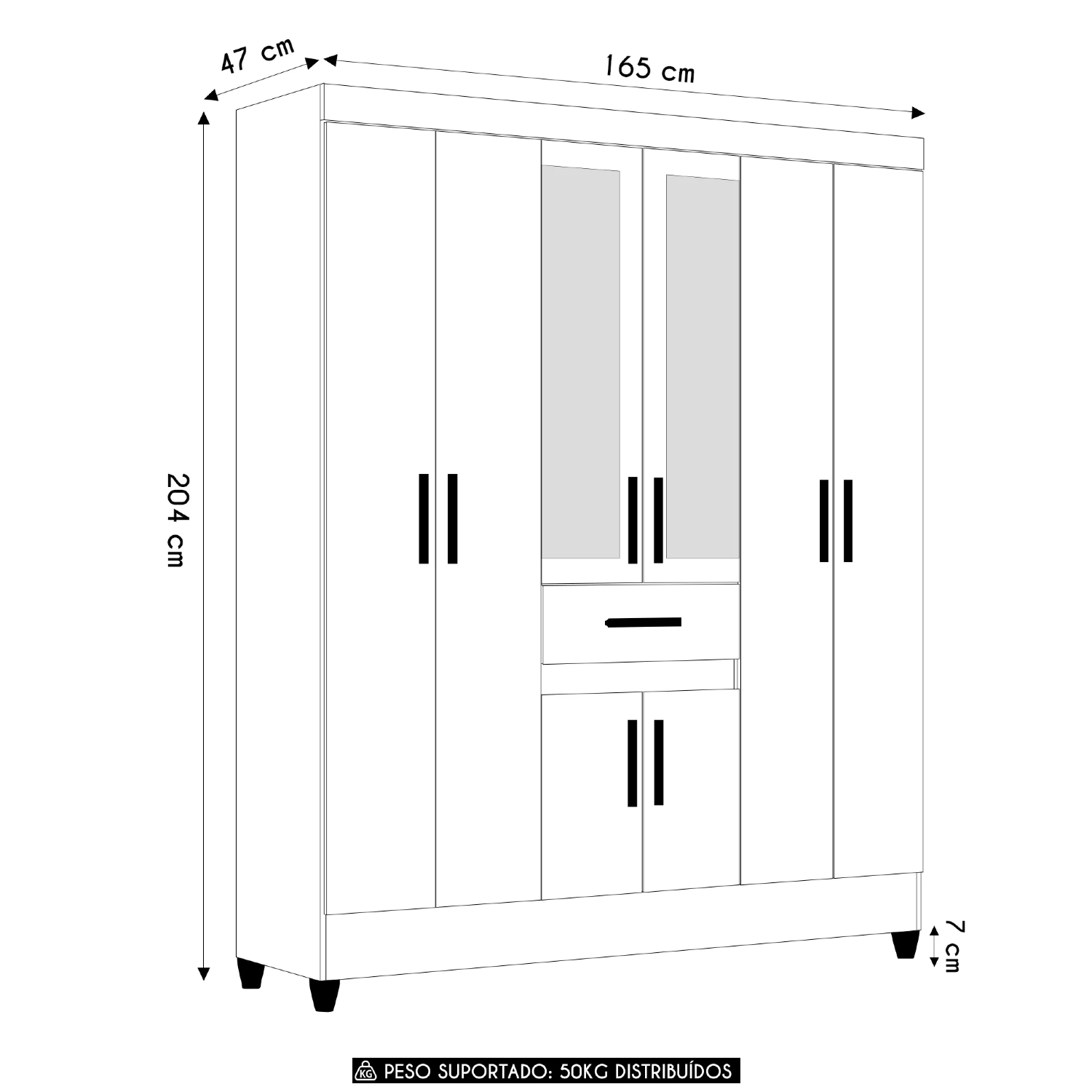 Os seis pés em PVC de 7cm oferecem estabilidade e facilitam na hora da limpeza do Quarto Casal, além de deixarem o móvel com um visual mais leve. É um Roupeiro firme e funcional, perfeito pra acompanhar sua rotina.