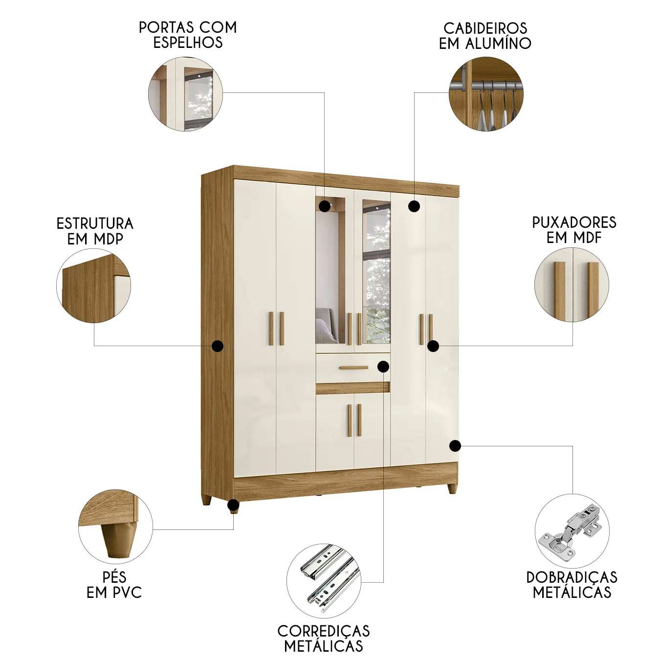Com uma gaveta espaçosa, você guarda tudo com facilidade, desde roupas íntimas até acessórios. As corrediças, dobradiças e cabideiro em alumínio garantem resistência e durabilidade, sem abrir mão da leveza no uso.