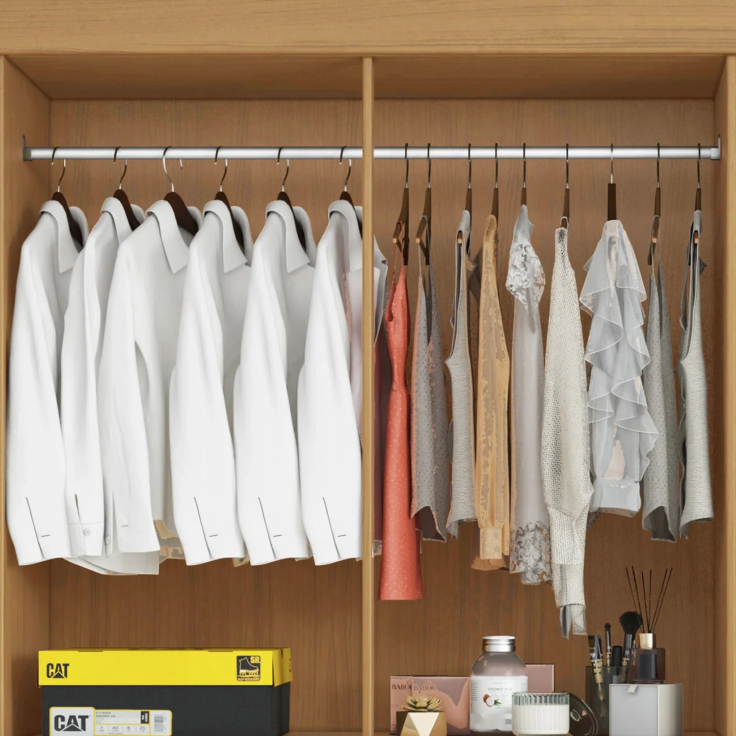 Suas dobradiças metálicas e corrediças telescópicas proporcionam maior suavidade e resistência em sua abertura. Um Roupeiro de Casal completo, funcional e ideal para ambientes amplos.