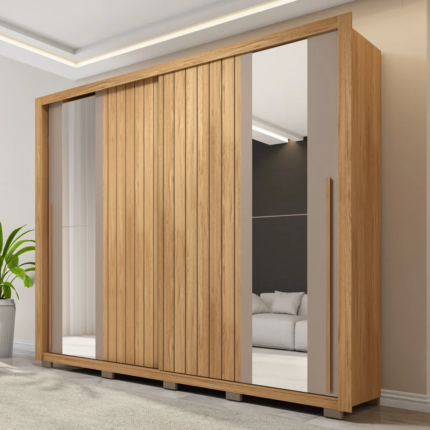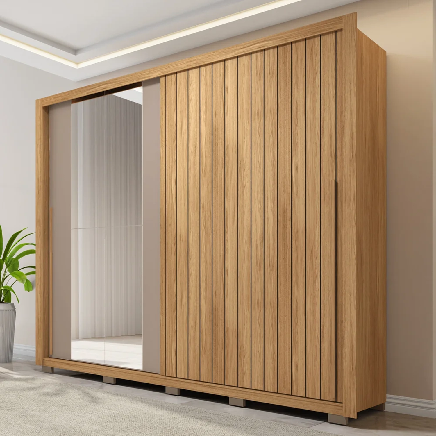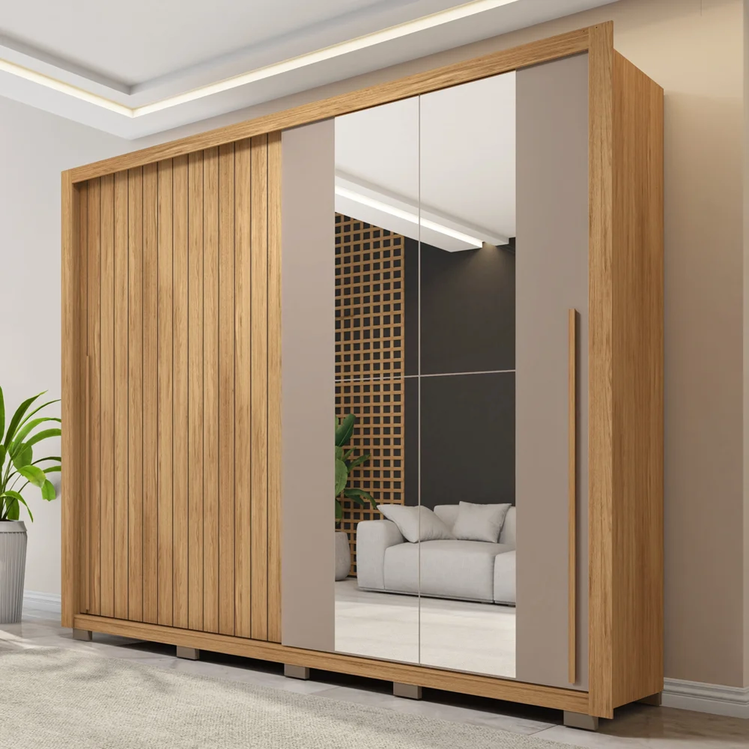 Perfeito para casais que prezam por um quarto organizado e cheio de estilo, esse guarda roupa com espelho não apenas atende às necessidades funcionais, mas também serve como peça central na decoração do ambiente. Internamente, cada centímetro é pensado para maximizar a organização: das gavetas amplas às várias prateleiras, além do cabideiro para vestidos e ternos. Já a opção de montagem com ou sem pés oferece versatilidade, enquanto o detalhe ripado nas portas agrega uma estética refinada. Para completar, as tonalidades harmonizam com qualquer paleta, fazendo desse guarda roupa 100% MDF a escolha perfeita para quem busca combinar utilidade e beleza no quarto de casal.