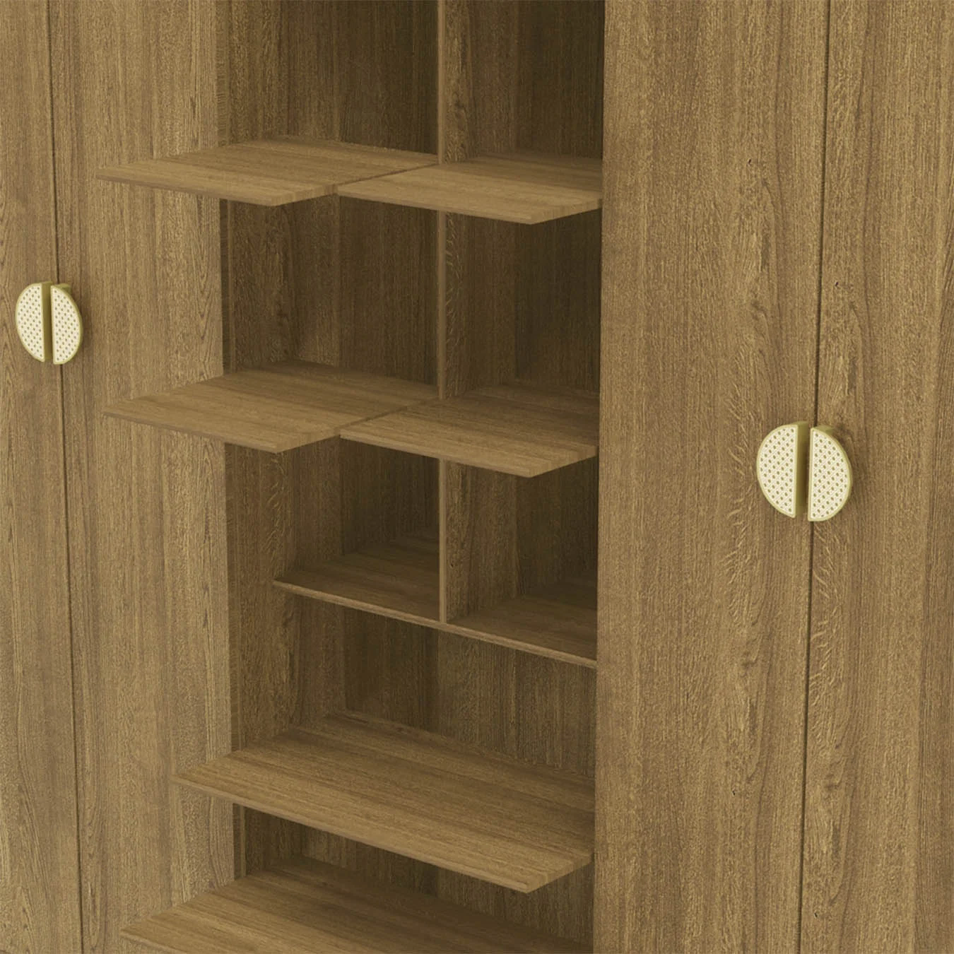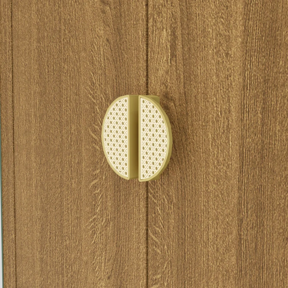 O acabamento externo do Guarda-Roupa Noronha segue um estilo minimalista com linhas retas, que conferem um design elegante e moderno. Os puxadores em poliestireno meia concha, com a combinação da textura da telinha e acabamento dourado, adicionam um toque de sofisticação e memória afetiva ao ambiente.