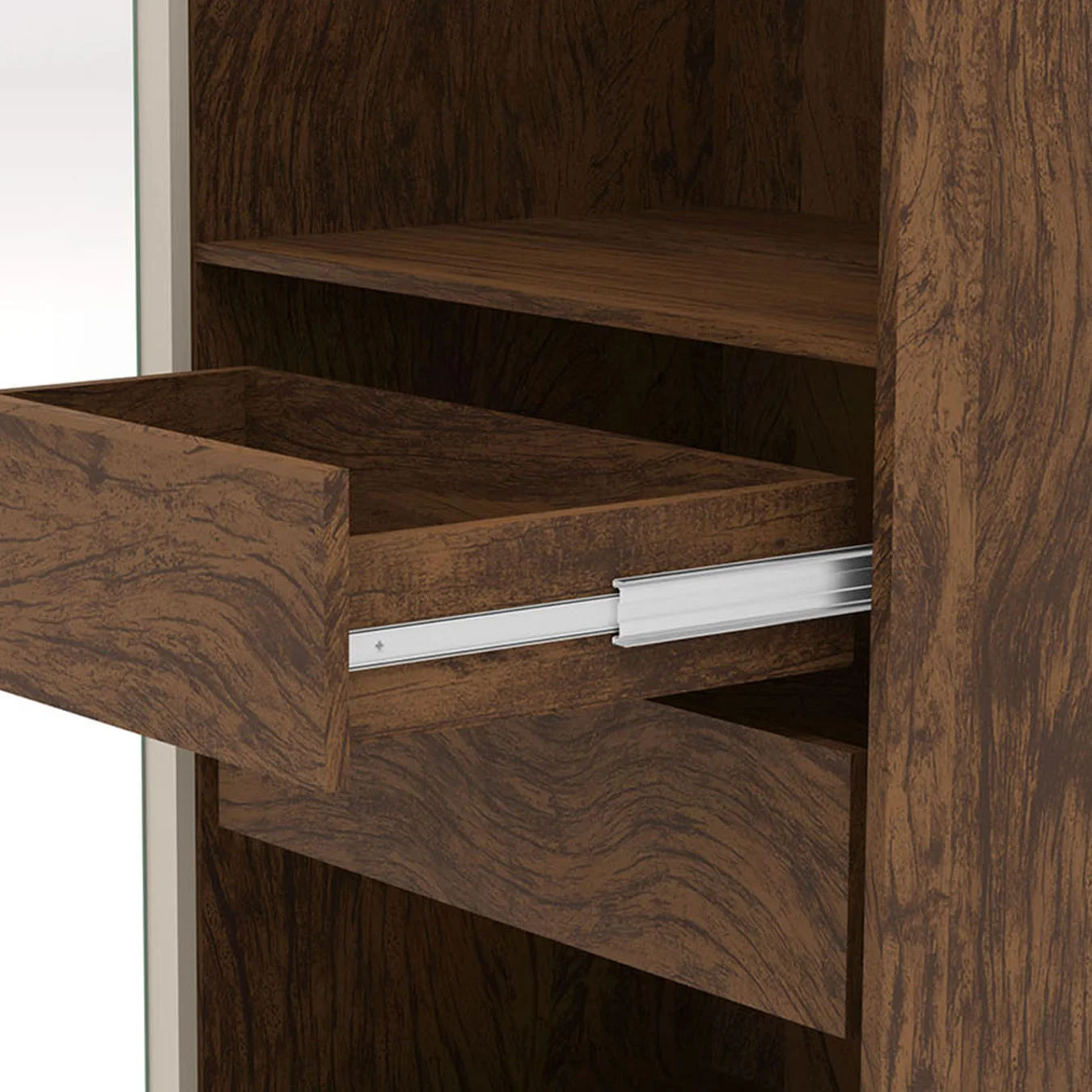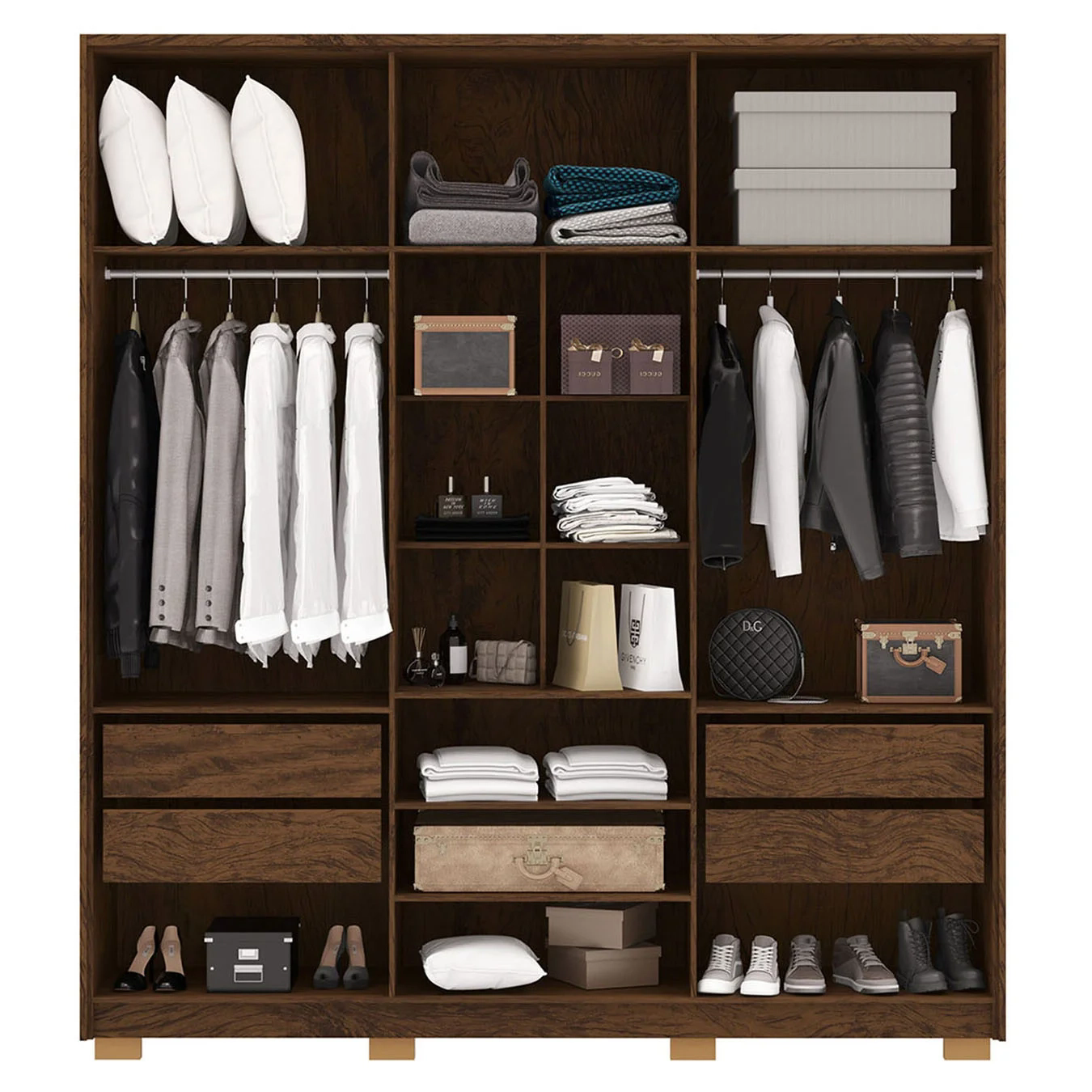 Sua divisão interna foi pensada para facilitar a organização. São quatro gavetas de abertura total com corrediças telescópicas, cabideiros em alumínio e prateleiras internas, proporcionando excelente aproveitamento de espaço e facilitando a organização das suas roupas e acessórios de forma eficiente.