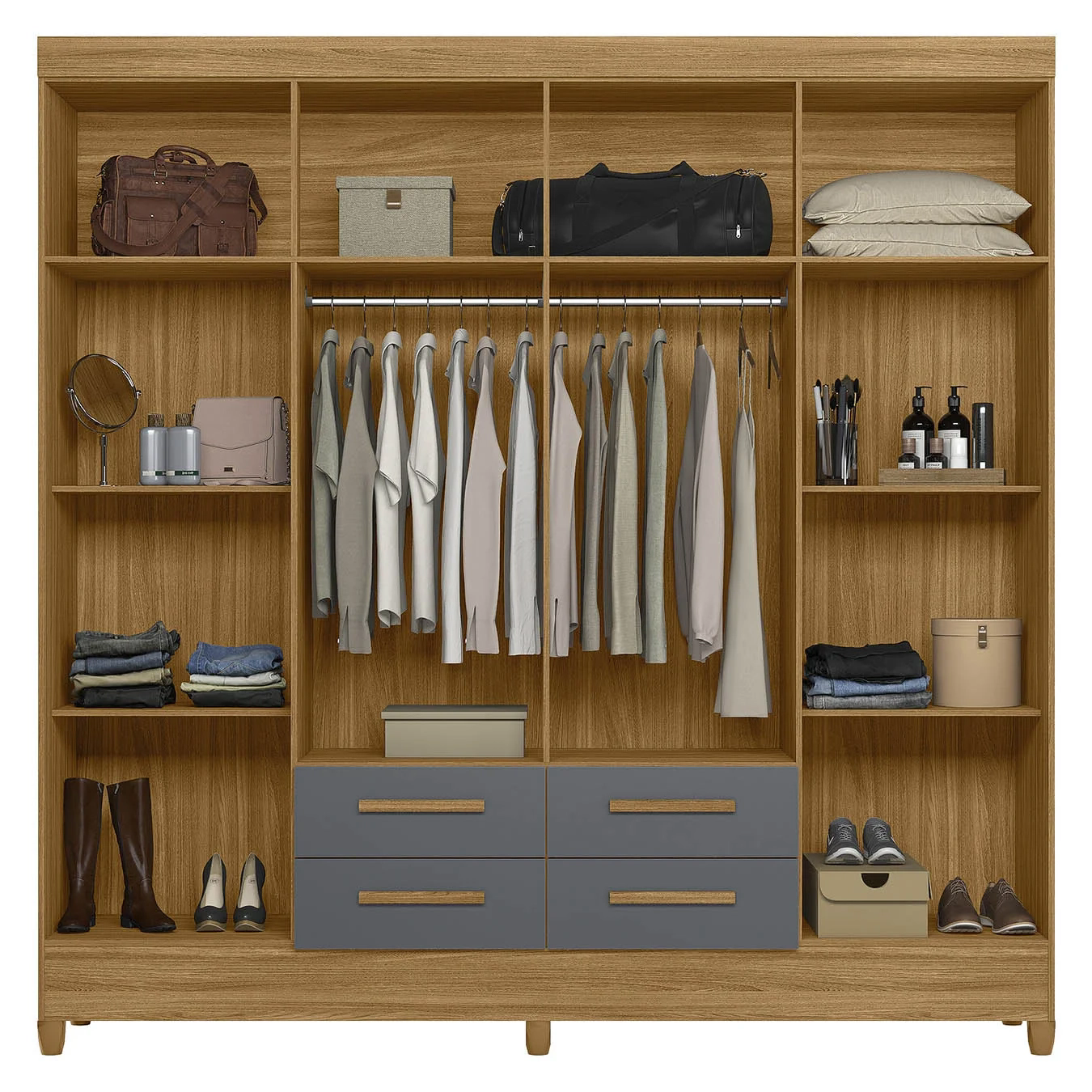 A distribuição interna é pensada para otimizar o espaço, com prateleiras perfeitas para organizar roupas e acessórios, dois cabideiros para manter suas roupas organizadas e sempre à mão.