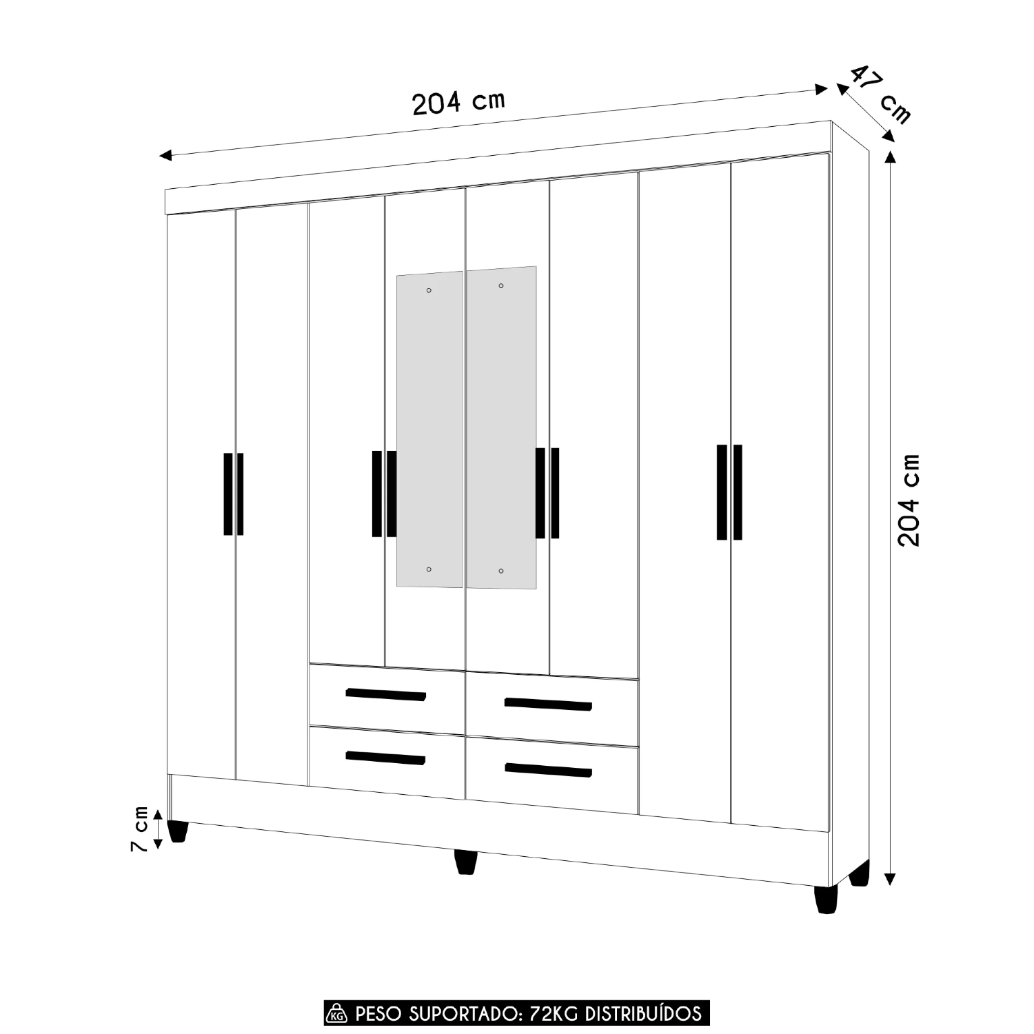 Com puxadores em MDF que agregam charme ao design, oferecendo um toque de sofisticação aliado à resistência enquanto duas portas com espelho trazem uma praticidade na hora de se arrumar. Esse Roupeiro é altamente funcional, contando com quatro gavetas com corrediças metálcias que proporcionam abertura total e suave.