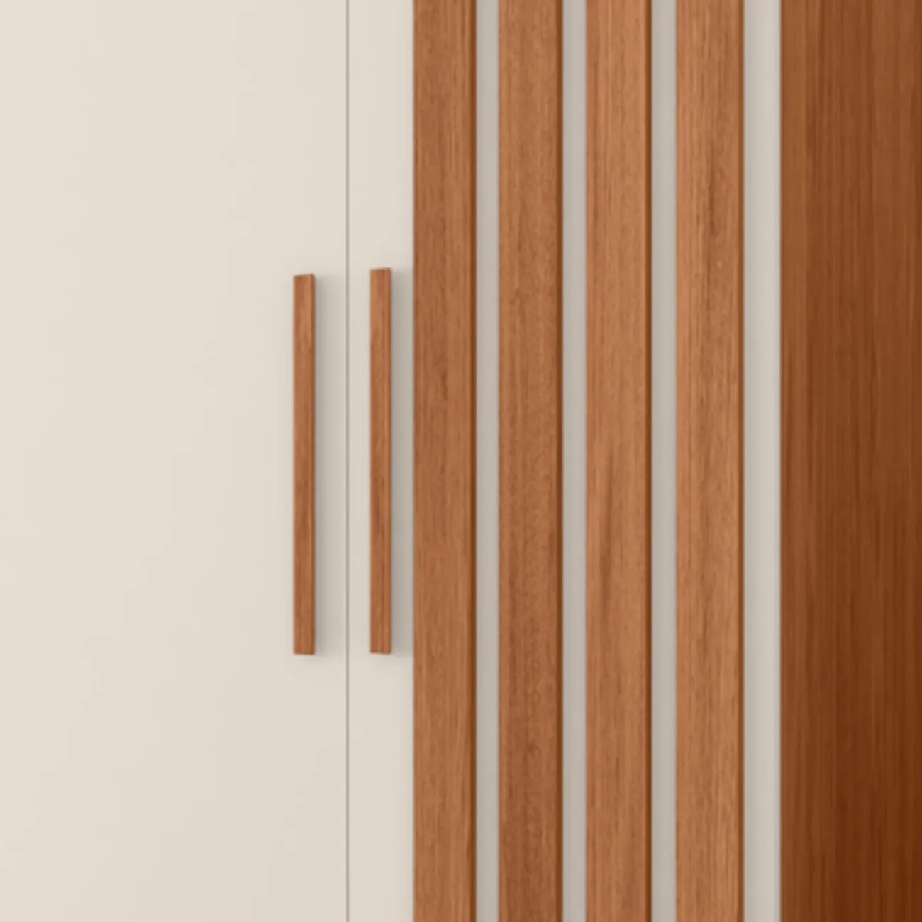 Esse Guarda Roupa conta com estrutura em MDP, duas portas com detalhe ripado que dão um charme especial e porta central com espelho, que ampliam o ambiente e trazem mais funcionalidade.