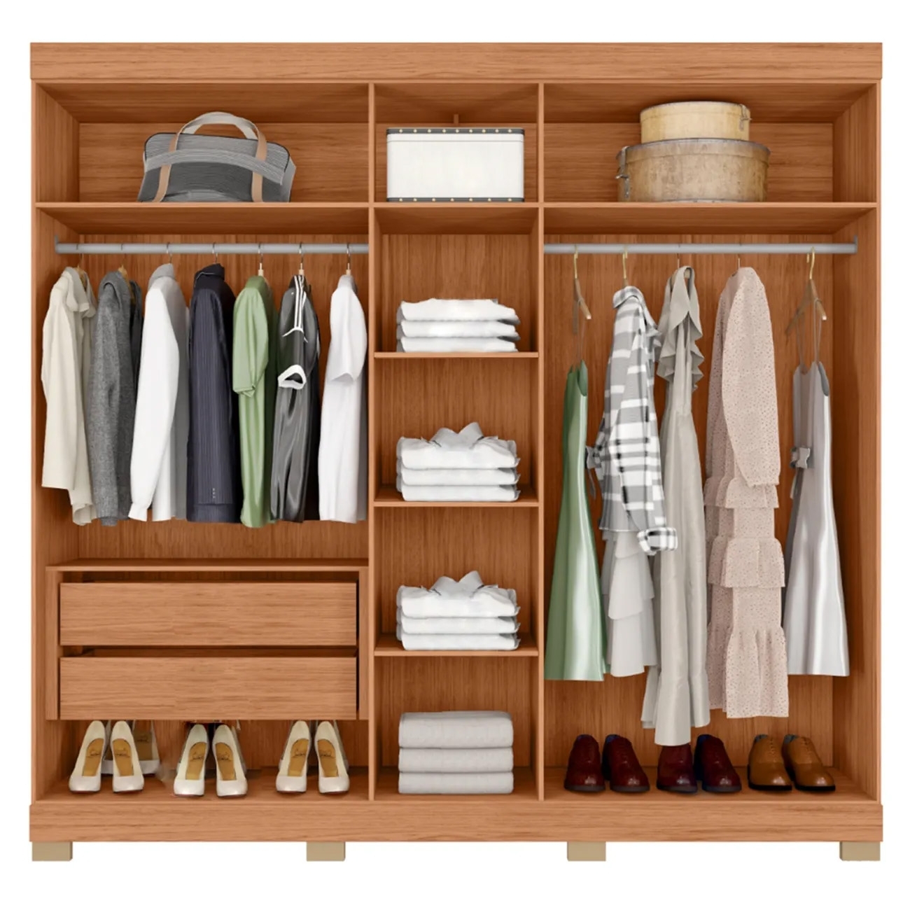 Internamente possui cabideiros pra manter suas roupas penduradas, duas gavetas com corrediças telescópicas que deslizam com facilidade e prateleiras ideais pra deixar tudo no lugar.