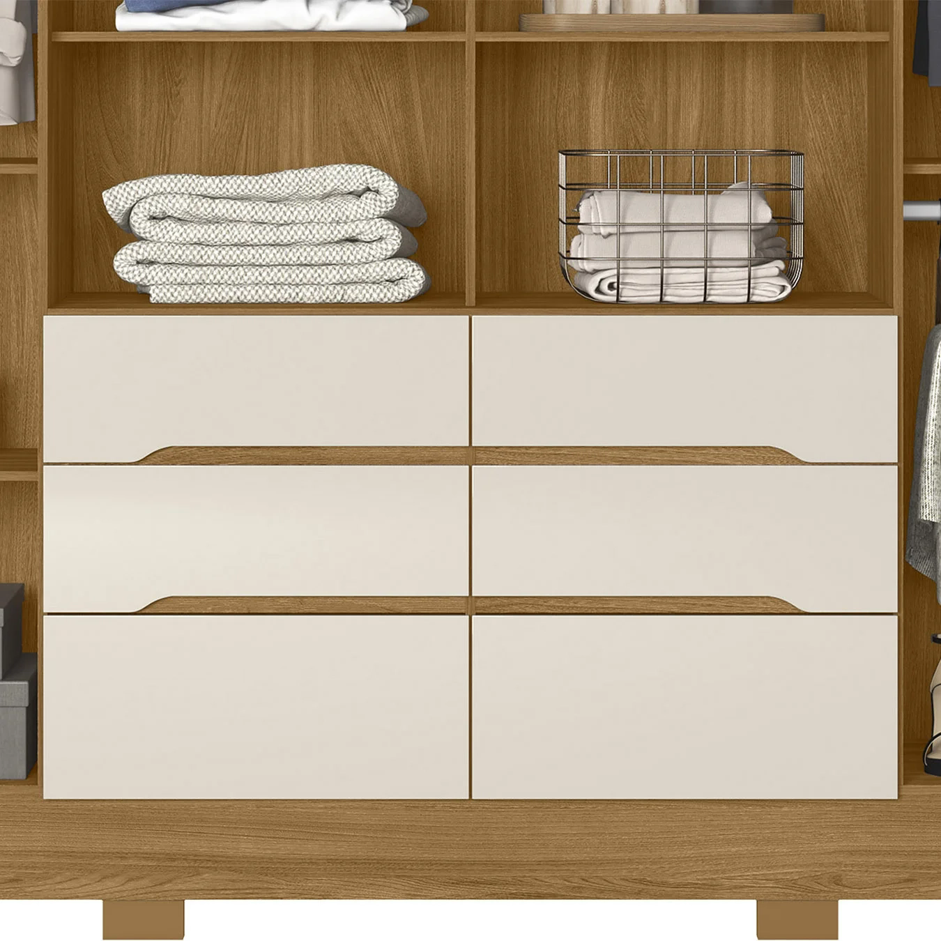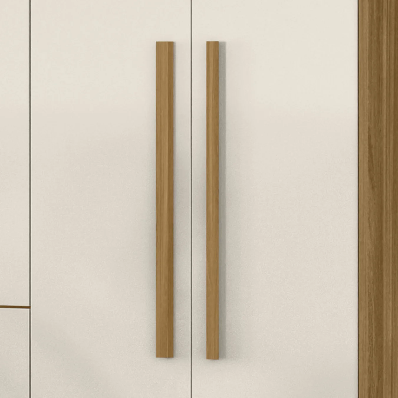Os puxadores em MDF nas portas e as gavetas com puxadores cava, agregam charme ao design, oferecendo um toque de sofisticação aliado à resistência. Esse Roupeiro é altamente funcional, contando com seis gavetas com corrediças telescópicas que proporcionam abertura total e suave.