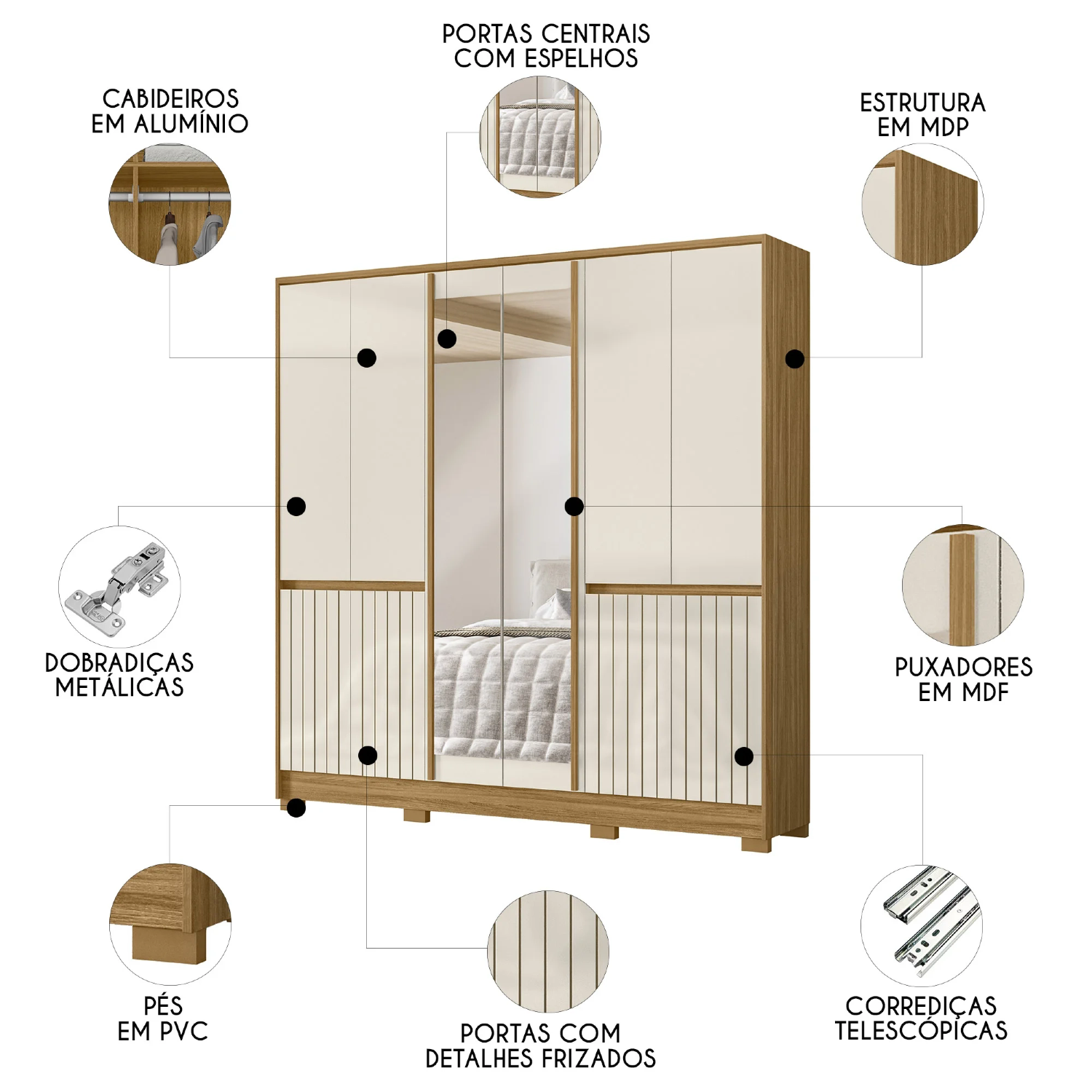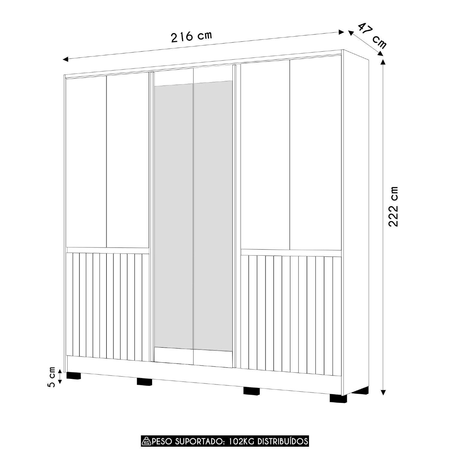 A estrutura é firmemente apoiada em seis pés de plástico PVC de 5cm, que garantem estabilidade e facilitam a limpeza do ambiente. O Guarda Roupa Com Espelho é um móvel completo, que une praticidade, beleza e resistência para tornar seu quarto ainda mais acolhedor.