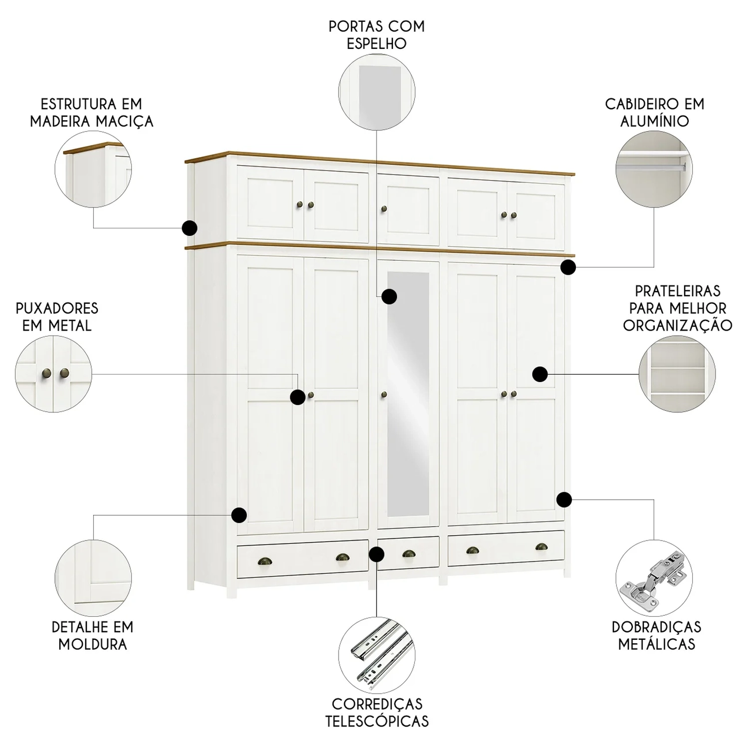 Conta com dez portas equipadas com dobradiças metálicas com amortecimento, garantindo maior durabilidade e um fechamento suave. Dentre essas, uma Porta Com Espelho adicionando um toque de elegância ao ambiente.