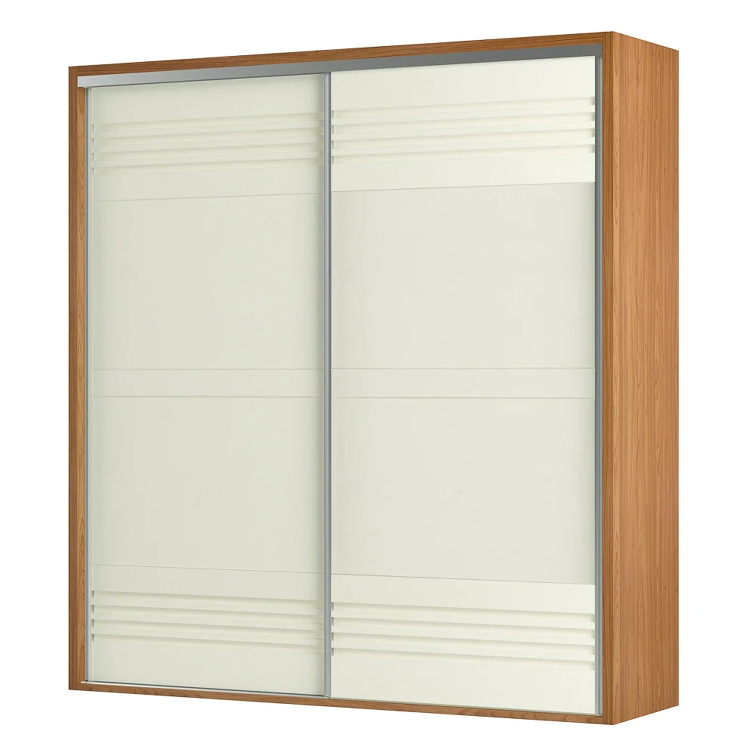 Esse guarda roupa com porta de correr é perfeito para quem quer otimizar espaço no quarto de casal, pois as portas com abertura deslizante não atrapalham a circulação do ambiente. Além disso, possui um excelente compartimento interno com várias prateleiras, 2 gavetas e cabideiros, itens perfeitos para manter tudo no lugar e facilitar a visualização das peças.