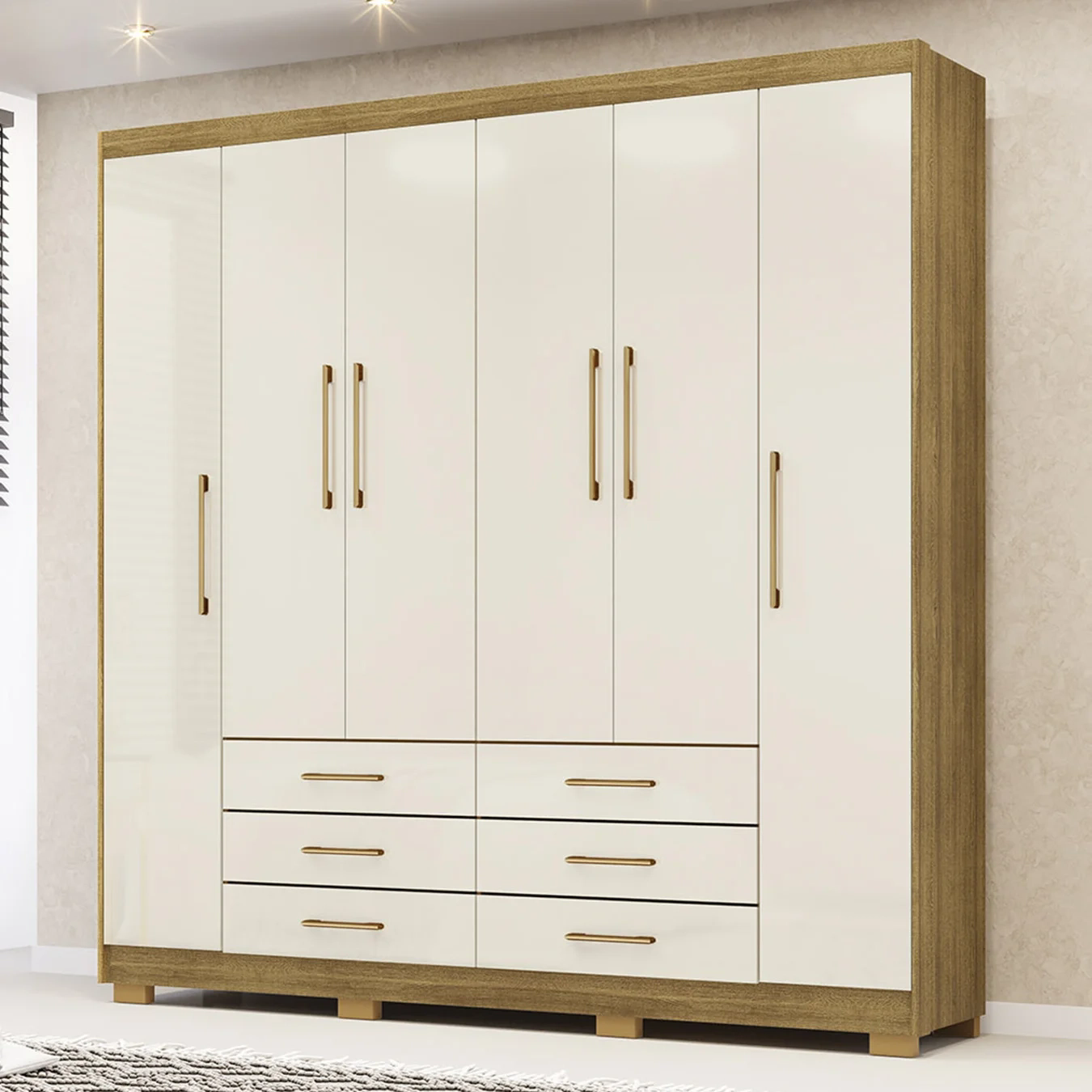 Com seis portas e puxadores diferenciados em acabamento dourado fosco, o guarda roupa adiciona um toque de sofisticação e elegância ao ambiente. Seu design moderno e refinado transforma o espaço, oferecendo mais do que apenas funcionalidade, mas também estilo e requinte para o seu Quarto Casal.