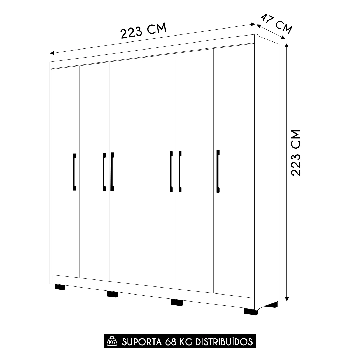Externamente, o modelo impressiona pelo design moderno. Os puxadores em ABS com acabamento metalizado e as vistas laterais mais largas conferem um toque de imponência ao móvel do Quarto. Os pés elevados não só facilitam a limpeza, mas também garantem um visual mais leve e prático para o ambiente, tornando o espaço mais organizado e funcional.