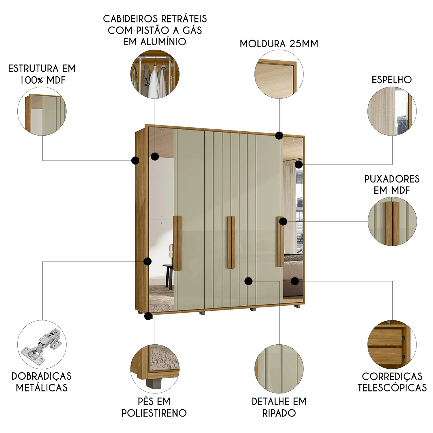 As seis portas convencionais sendo as duas laterais com espelho, contam com dobradiças metálicas já com sistema de amortecimento, garantindo um fechamento suave e silencioso. As prateleiras internas bem distribuídas acomodam diferentes tipos de itens, desde bolsas, sapatos até malas. Os puxadores em MDF reforçam o visual minimalista.