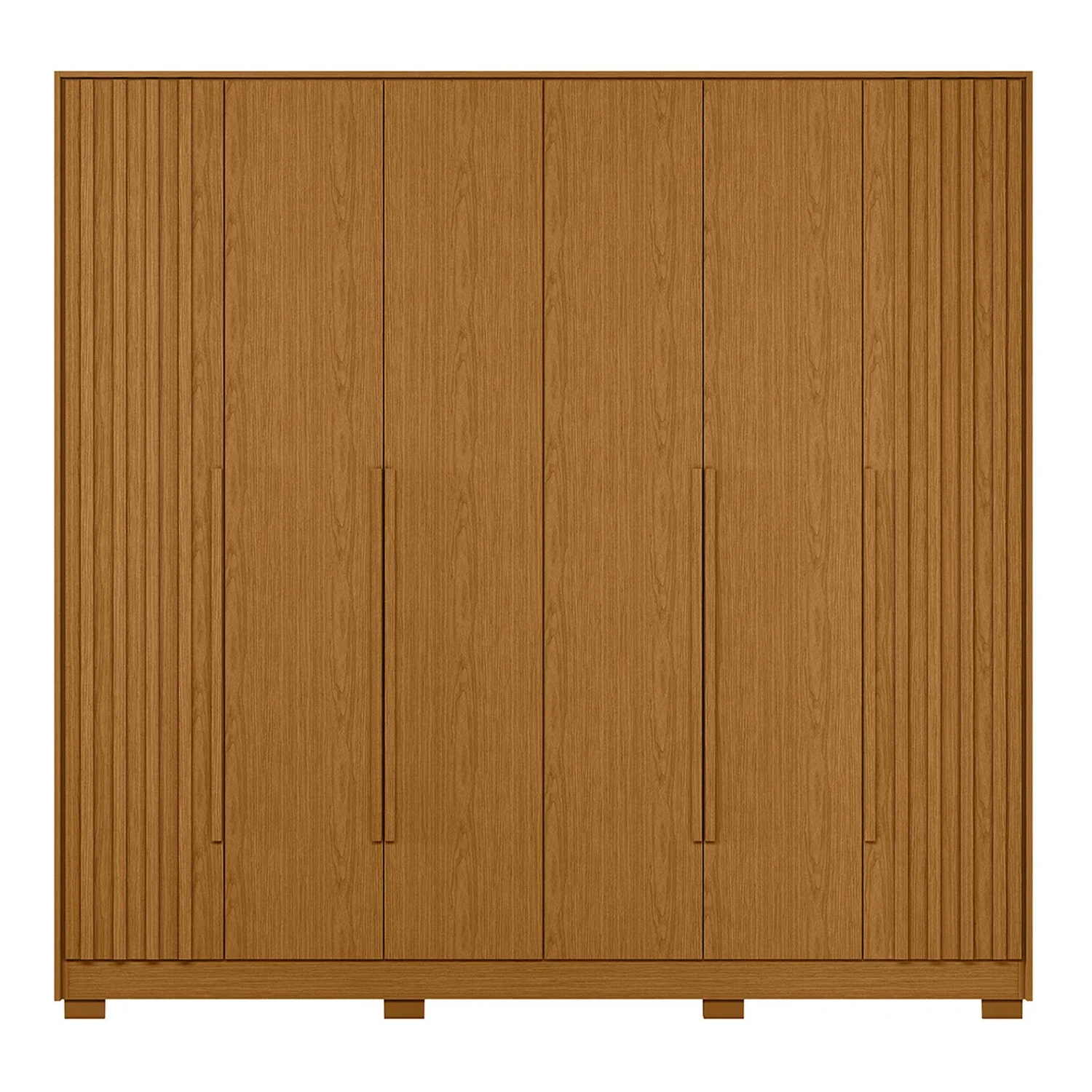 Com seis portas de dobradiças metálicas, o design permite uma abertura suave e duradoura. As portas laterais apresentam um belo detalhe ripado, que acrescenta um toque de modernidade e estilo ao Guarda Roupa 6 Portas, tornando-o um destaque no seu quarto ou closet. As quatro gavetas, equipadas com corrediças telescópicas, permitem um deslizamento perfeito, facilitando o acesso aos itens menores como roupas íntimas, acessórios e objetos pessoais. Os puxadores de MDF revestidos acrescentam um acabamento elegante, complementando o visual refinado. O design inteligente também inclui dois cabideiros em alumínio, ideais para pendurar suas roupas com praticidade e eficiência. Com moldura de 15mm, o Guarda Roupa oferece uma base robusta e estável, garantindo durabilidade e resistência. Os pés inclusos conferem um toque de leveza ao design, além de facilitarem a limpeza.