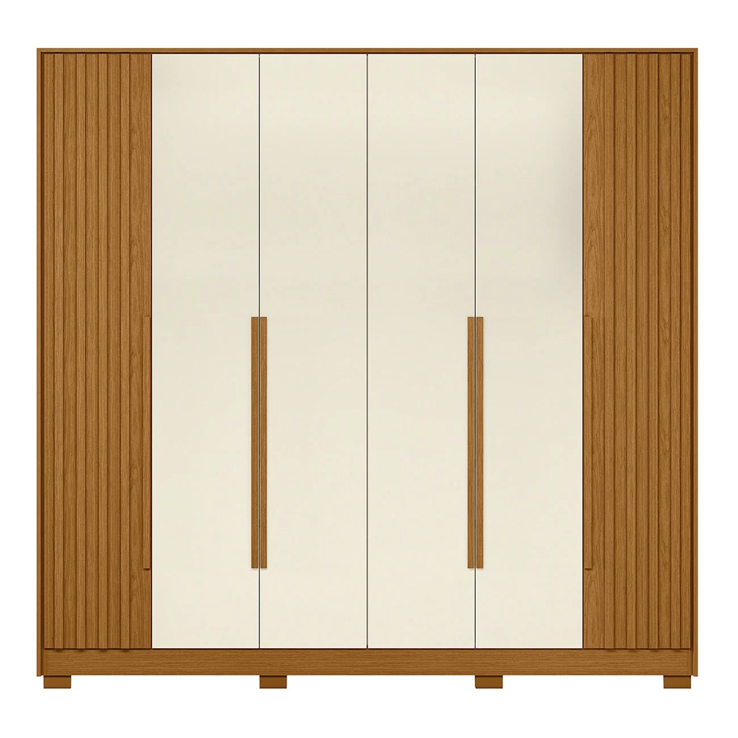 Com seis portas de dobradiças metálicas, o design permite uma abertura suave e duradoura. As portas laterais apresentam um belo detalhe ripado, que acrescenta um toque de modernidade e estilo ao Guarda Roupa 6 Portas, tornando-o um destaque no seu quarto ou closet. As quatro gavetas, equipadas com corrediças telescópicas, permitem um deslizamento perfeito, facilitando o acesso aos itens menores como roupas íntimas, acessórios e objetos pessoais. Os puxadores de MDF revestidos acrescentam um acabamento elegante, complementando o visual refinado. O design inteligente também inclui dois cabideiros em alumínio, ideais para pendurar suas roupas com praticidade e eficiência. Com moldura de 15mm, o Guarda Roupa oferece uma base robusta e estável, garantindo durabilidade e resistência. Os pés inclusos conferem um toque de leveza ao design, além de facilitarem a limpeza.