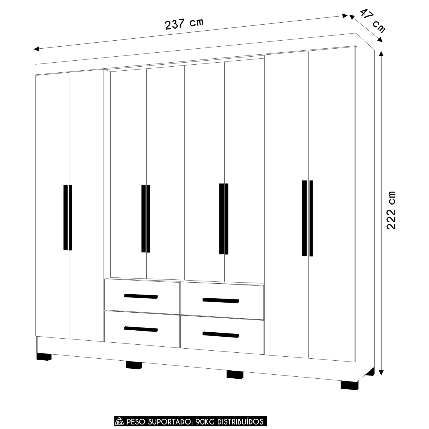 Este Guarda Roupa com oito portas é a união perfeita entre funcionalidade e design moderno, ideal para quem busca praticidade sem abrir mão da elegância. As portas abrem suavemente devido às dobradiças metálicas de alta qualidade feitas em alumínio, garantindo um uso silencioso e duradouro.