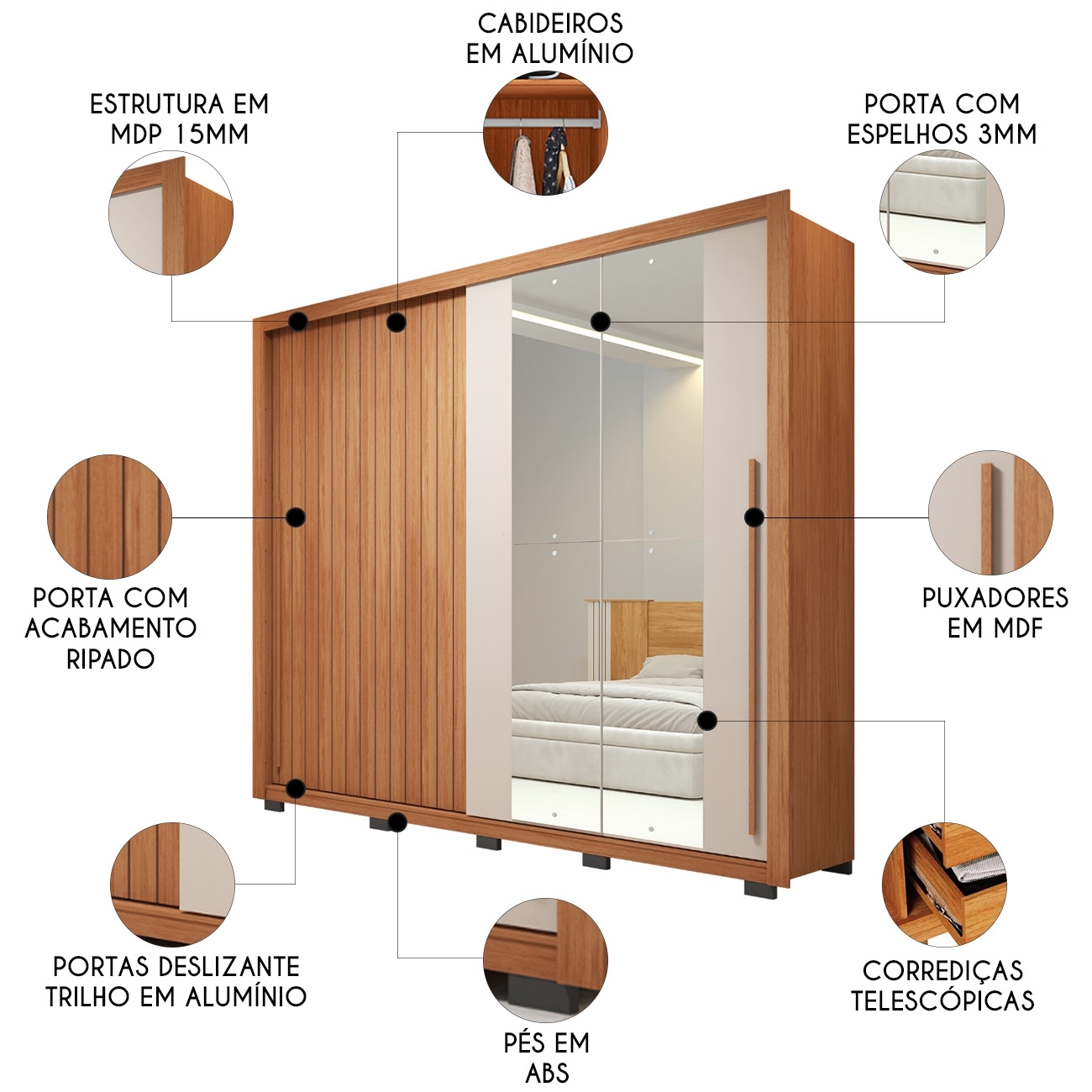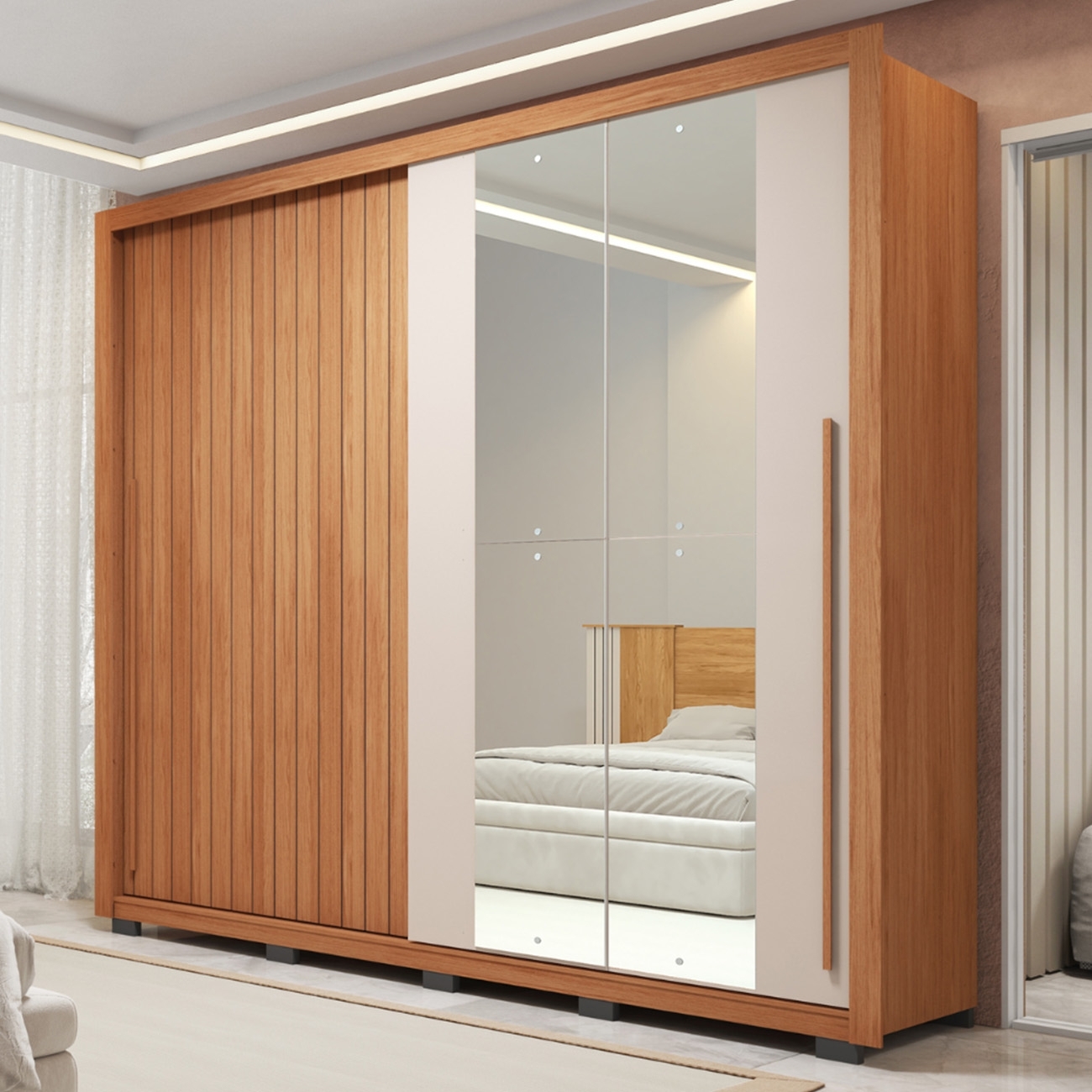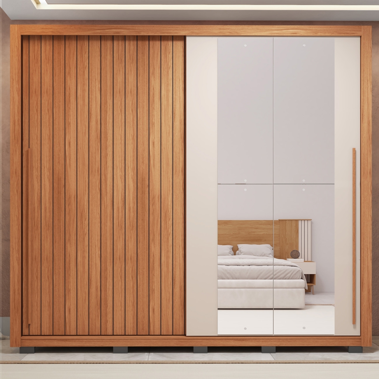 Um dos destaques está nas portas, uma delas tem acabamento ripado super estiloso, e a outra vem com espelho, que além de funcional, ainda ajuda a ampliar seu Quarto de Casal visualmente.