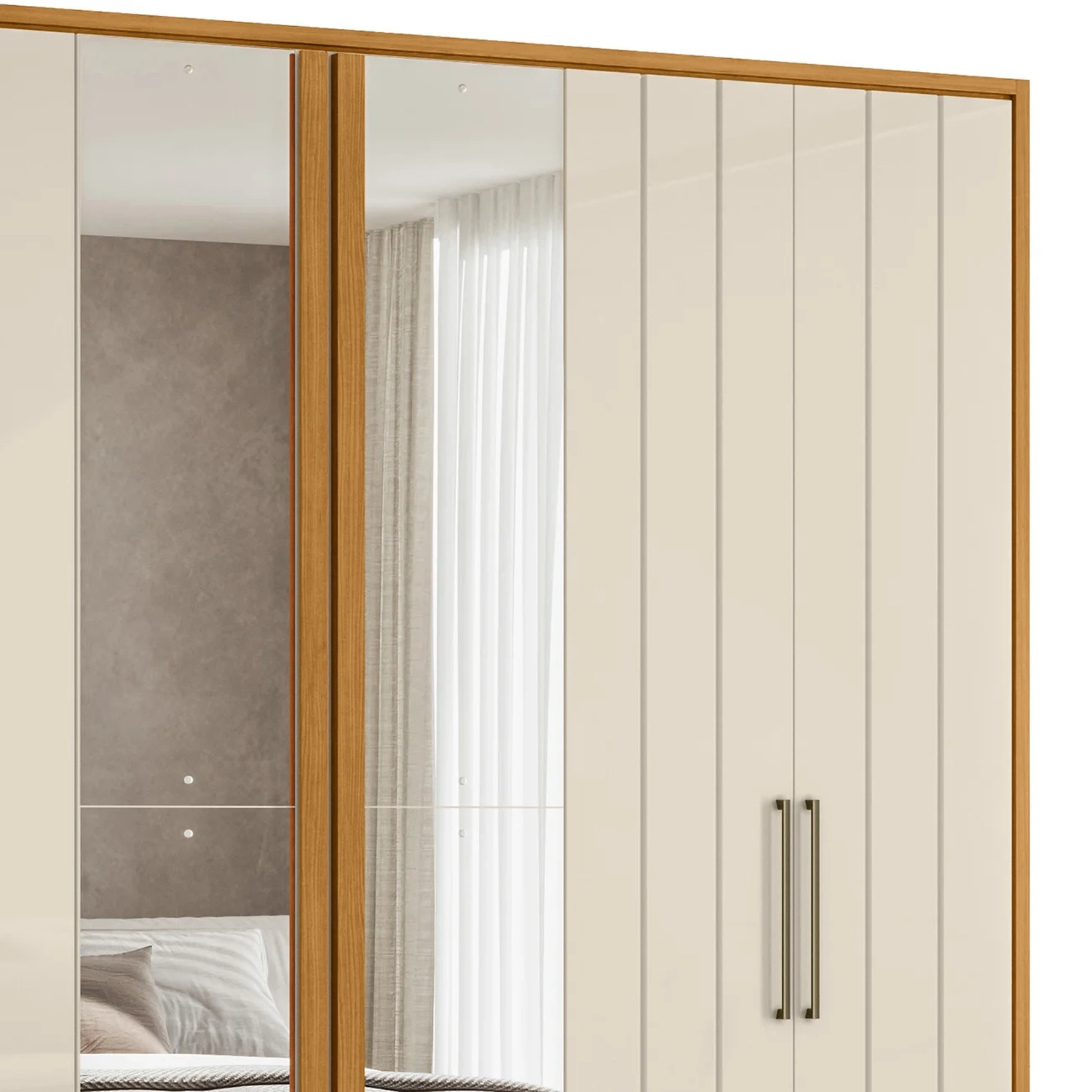 As portas convencionais do Guarda Roupa Casal contam com dobradiças metálicas com amortecimento, oferecendo um fechamento suave e silencioso. São seis portas sendo duas centrais com espelho, e prateleiras internas que facilitam a organização e acomodação dos mais diversos itens. Os puxadores em MDF, combinados com puxadores laterais em alumínio, complementam o design moderno e funcional.