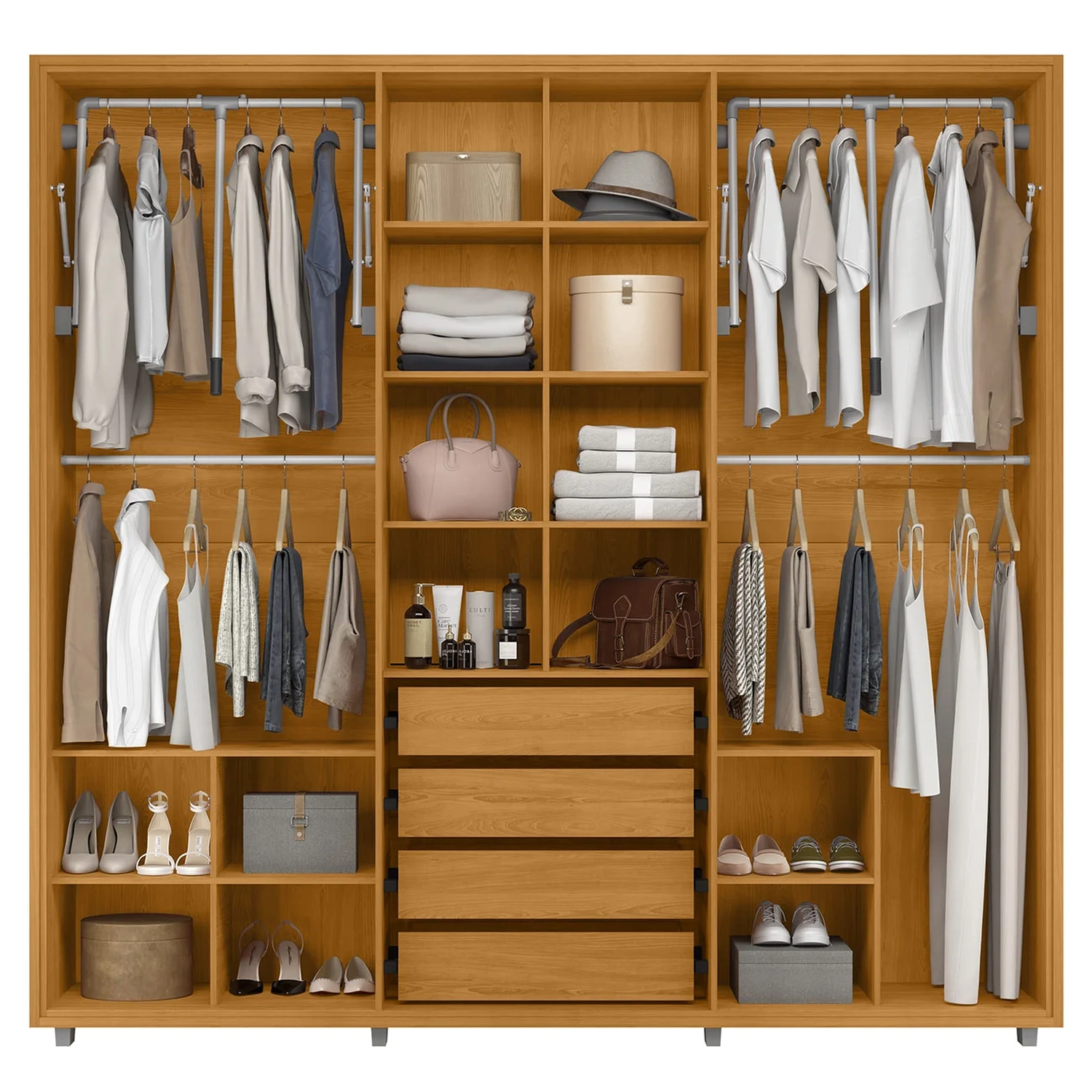 No interior do Guarda Roupa 6 Portas, o espaço é aproveitado com eficiência por meio dos cabideiros superiores retráteis em alumínio, que contam com pistão a gás, proporcionando praticidade no dia a dia. Além disso, os cabideiros otimizam a organização das roupas, permitindo fácil acesso e melhor visualização das peças.