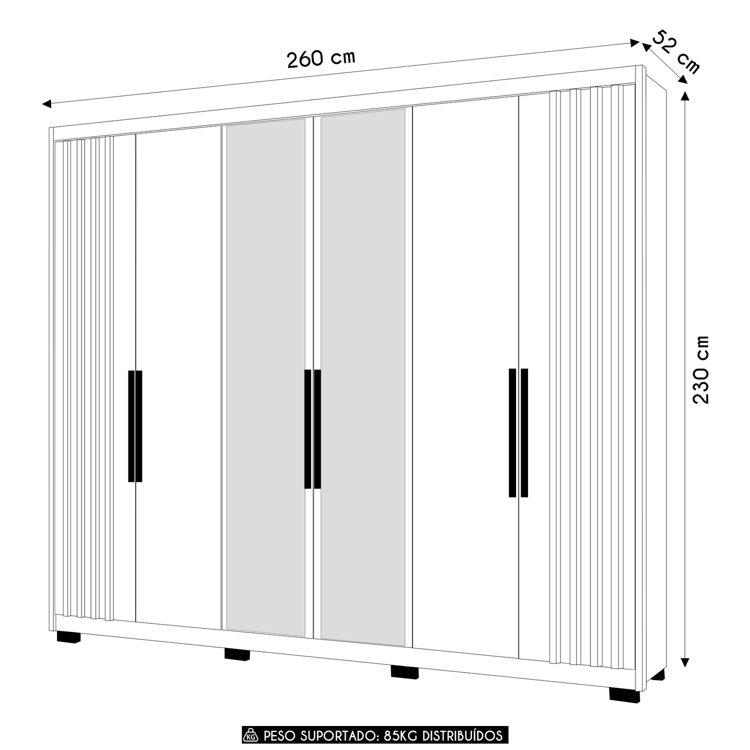 Este Guarda Roupa com seis portas é a união perfeita entre funcionalidade e design moderno, ideal para quem busca praticidade sem abrir mão da elegância. As portas abrem suavemente devido às dobradiças metálicas de alta qualidade feitas em alumínio, garantindo um uso silencioso e duradouro.