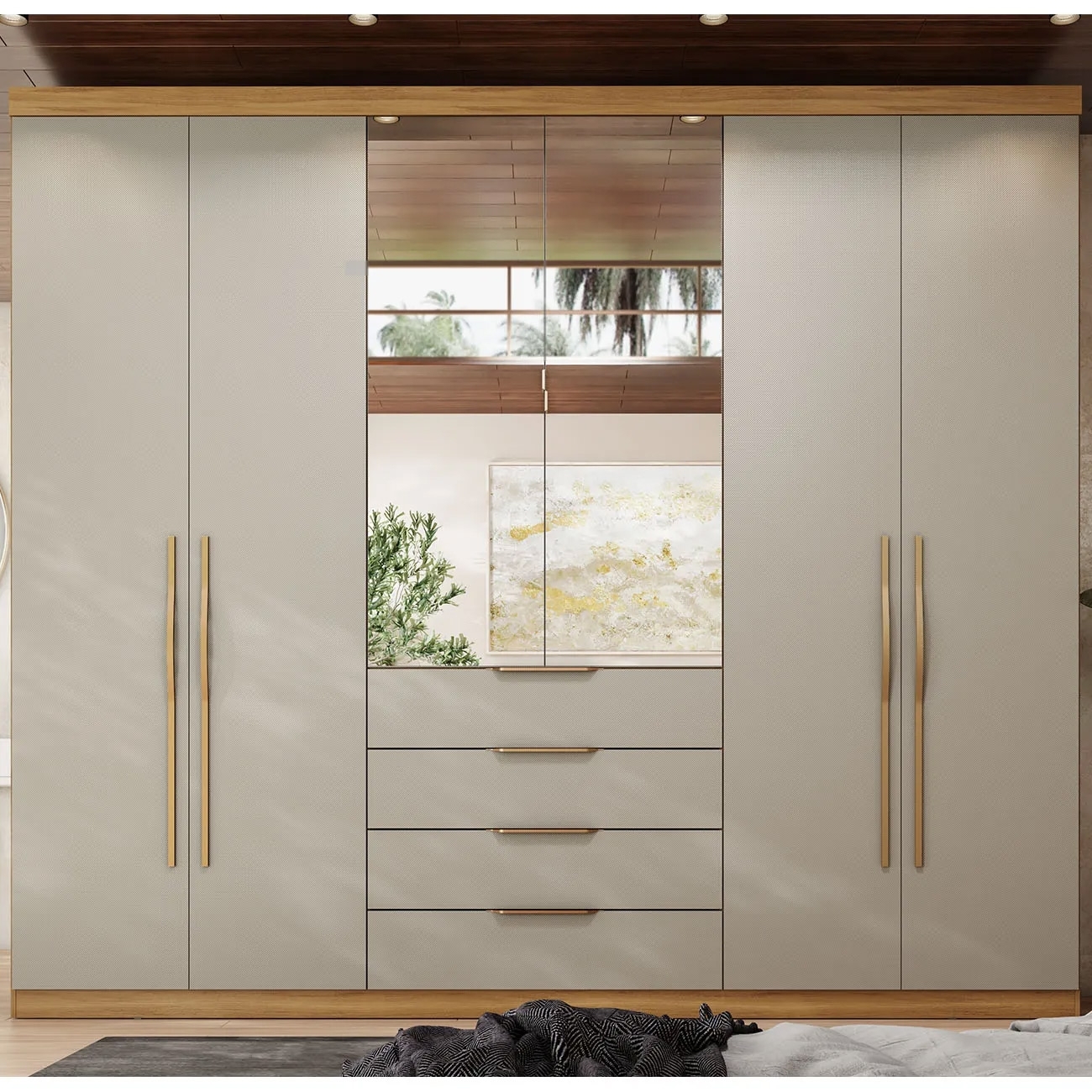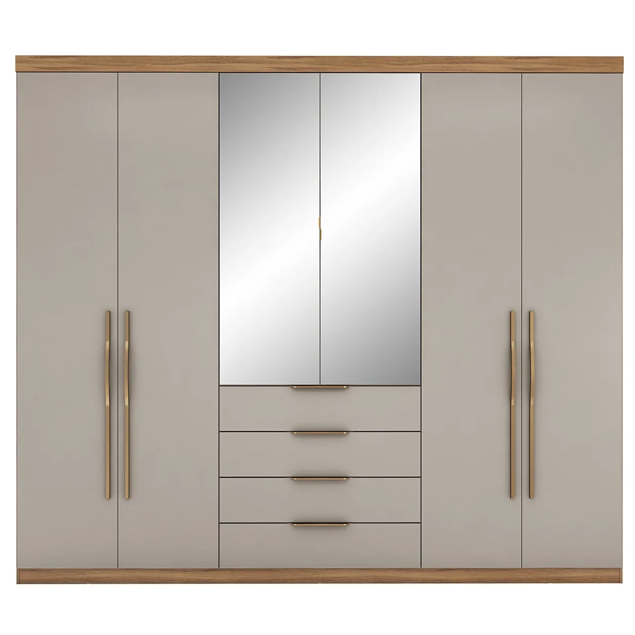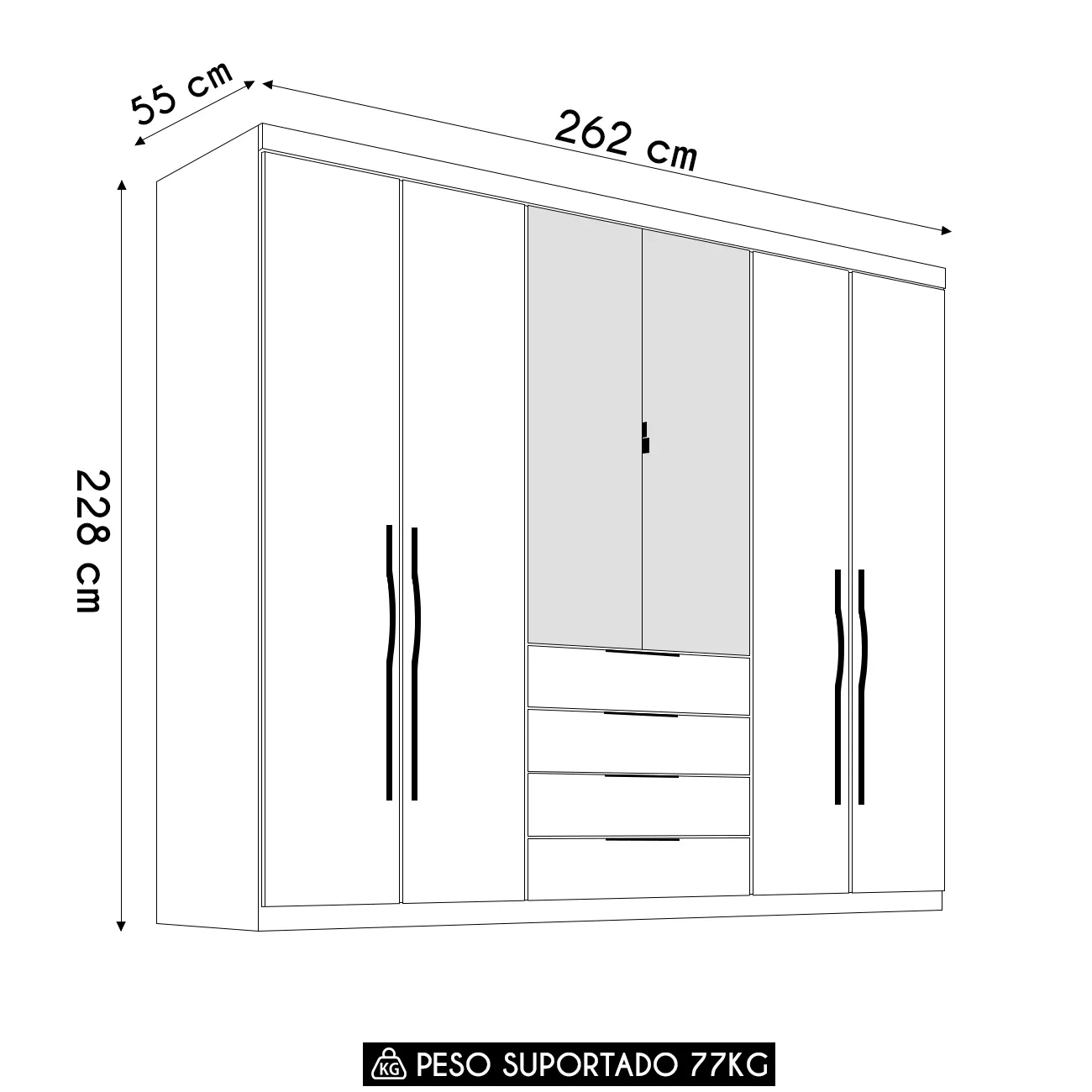 Com suas seis portas convencionais, você terá fácil acesso a todas as suas roupas e acessórios. As duas portas centrais possuem puxadores metálicos, com espelho em toda a extensão, além de proporcionar um visual mais amplo e moderno ao Quarto de Casal, servem como um prático espelho para auxiliar no dia a dia. As quatro gavetas, equipadas com corrediças telescópicas, deslizam suavemente e oferecem um espaço extra para organizar peças menores, como meias, roupas íntimas e acessórios. Os puxadores modernos em ABS conferem um toque de sofisticação as gavetas e portas laterais, combinando funcionalidade e design. O interior do Guarda Roupa Casal é extremamente espaçoso, permitindo que você organize todas as suas roupas de forma prática e eficiente. Com diversas prateleiras e cabideiros, você terá espaço de sobra para pendurar vestidos, camisas, calças e casacos, além de guardar sapatos, bolsas e outros itens.