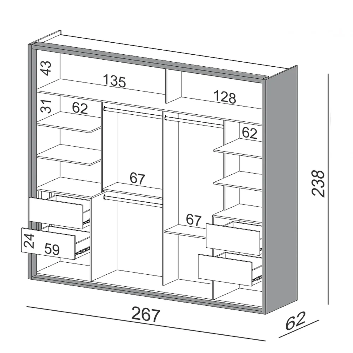 Esse guarda roupa com porta de correr é perfeito para quem quer otimizar espaço no quarto de casal, pois as portas com abertura deslizante não atrapalham a circulação do ambiente. Além disso, o seu design com 267cm possui um excelente compartimento interno com várias prateleiras, 4 gavetas e cabideiros, itens perfeitos para manter tudo no lugar e facilitar a visualização das peças.