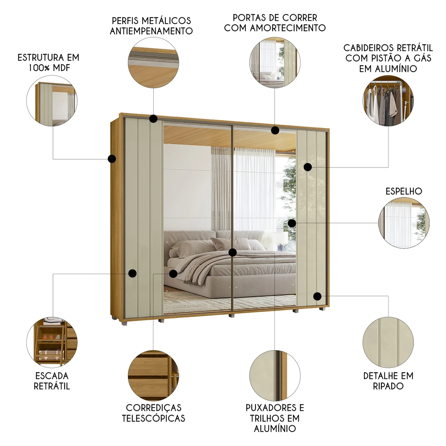 O Guarda Roupa 2 Portas conta com cabideiros retráteis em alumínio e com pistão a gás, otimizando o espaço interno e proporcionando uma organização eficiente das roupas. Além disso, as portas deslizantes possuem espelhos para auxiliar no dia a dia, nas laterais conta com escadas internas acopladas para acessar as partes mais altas. Os puxadores em alumínio complementam o design minimalista e sofisticado.