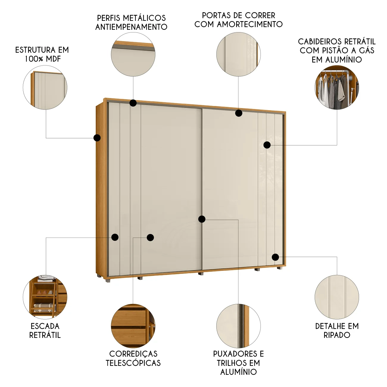 O Guarda Roupa 2 Portas conta com cabideiros retráteis em alumínio e com pistão a gás, otimizando o espaço interno e proporcionando uma organização eficiente das roupas. Além disso, nas laterais conta com escadas internas acopladas para acessar as partes mais altas. Os puxadores em alumínio complementam o design minimalista e sofisticado.