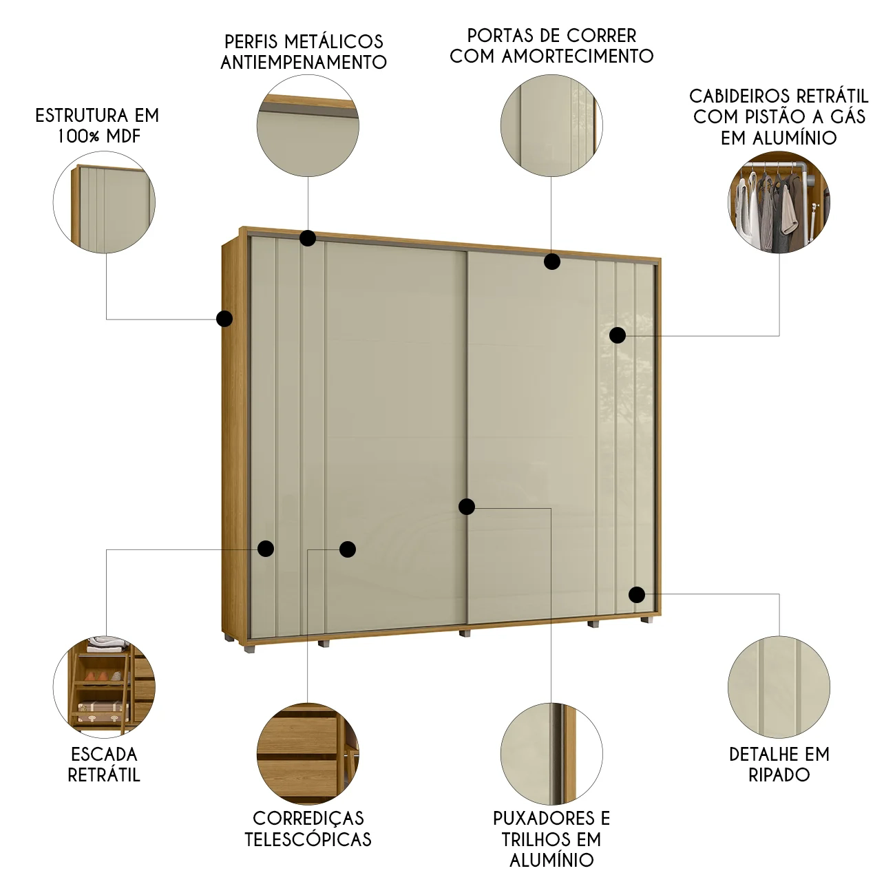 O Guarda Roupa 2 Portas conta com cabideiros retráteis em alumínio e com pistão a gás, otimizando o espaço interno e proporcionando uma organização eficiente das roupas. Além disso, nas laterais conta com escadas internas acopladas para acessar as partes mais altas. Os puxadores em alumínio complementam o design minimalista e sofisticado.