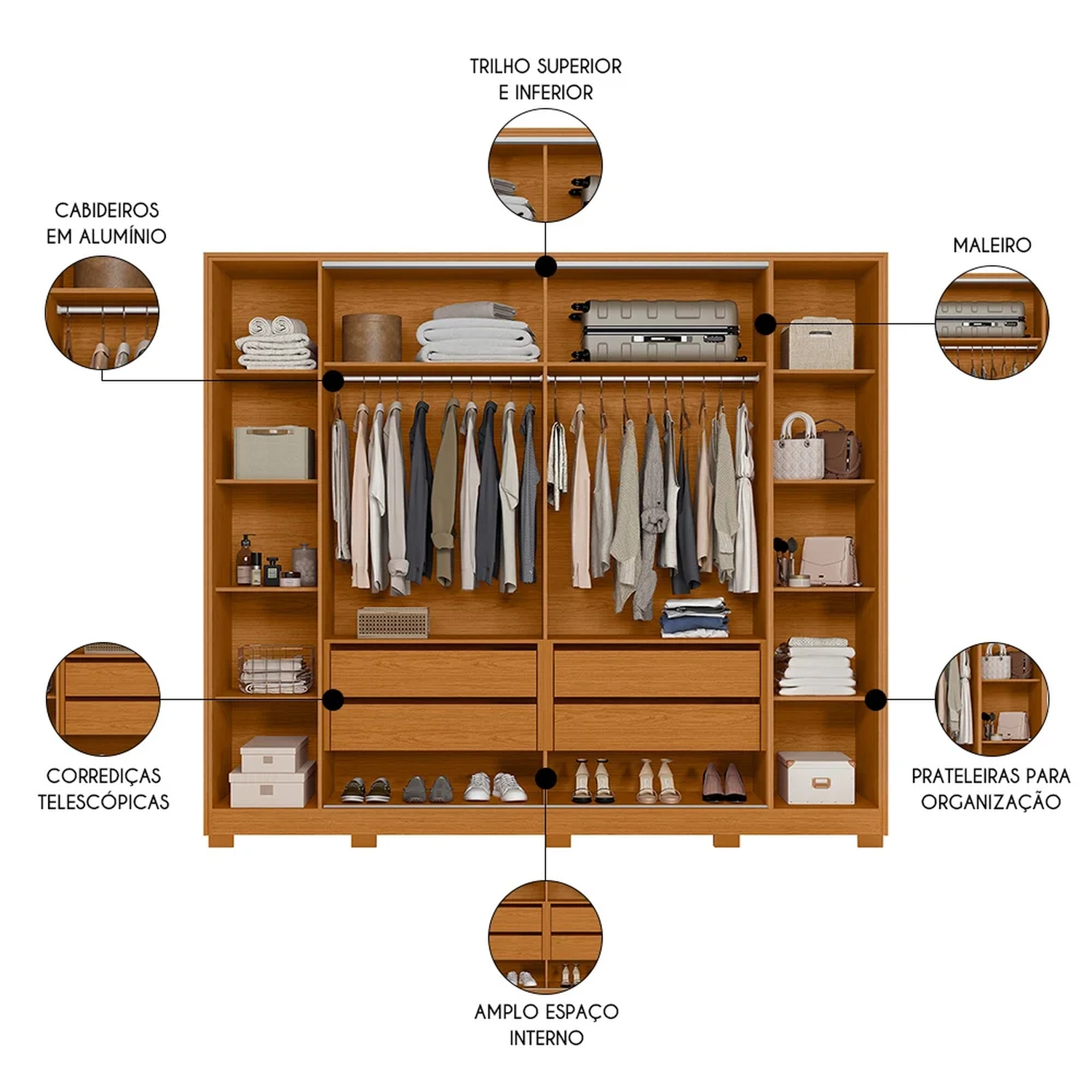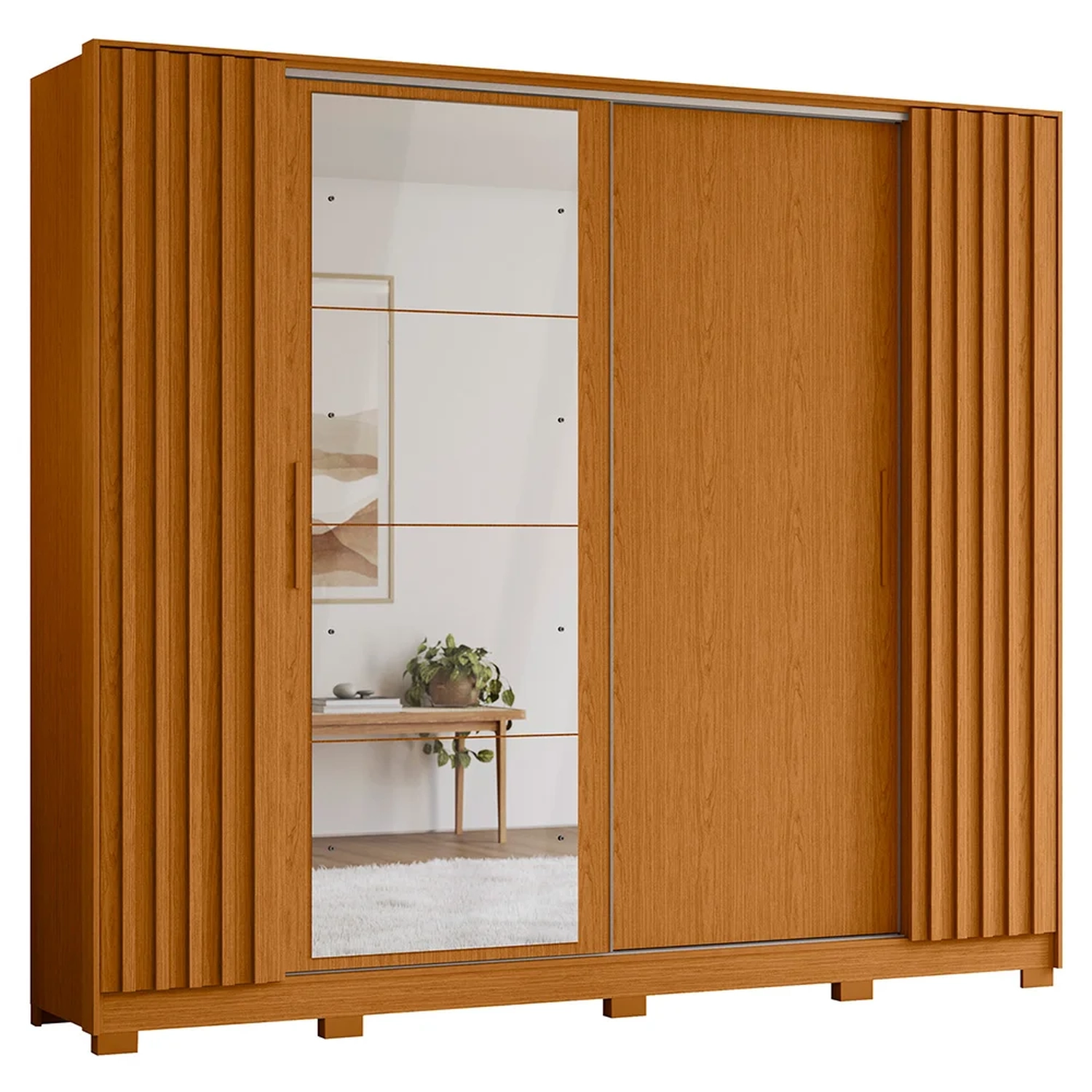 Esse guarda roupa casal grande, além de espaçoso para dispor roupas, calçados e demais itens, já que conta com vários nichos, cabideiros e gavetas; ainda é muito versátil, pois as tem 2 portas de correr e 2 portas de abrir convencional com detalhes ripados, o que torna o design moderno e cheio de estilo. Ah, e as portas de correr centrais são com montagem flex, isto é, você pode optar o lado da cor que mais lhe agrada e, assim, personalizar de acordo com o seu gosto. O toque de sofisticação é revelado nos 4 espelhos, que além de servir para conferir o look, ainda cria uma sensação de profundidade no ambiente. Para completar, os pés são excelentes aliados na conservação do roupeiro, pois evitam o contato direto com o chão e com a umidade, ou seja, você terá um guarda roupa resistente e durável por muito mais tempo.
