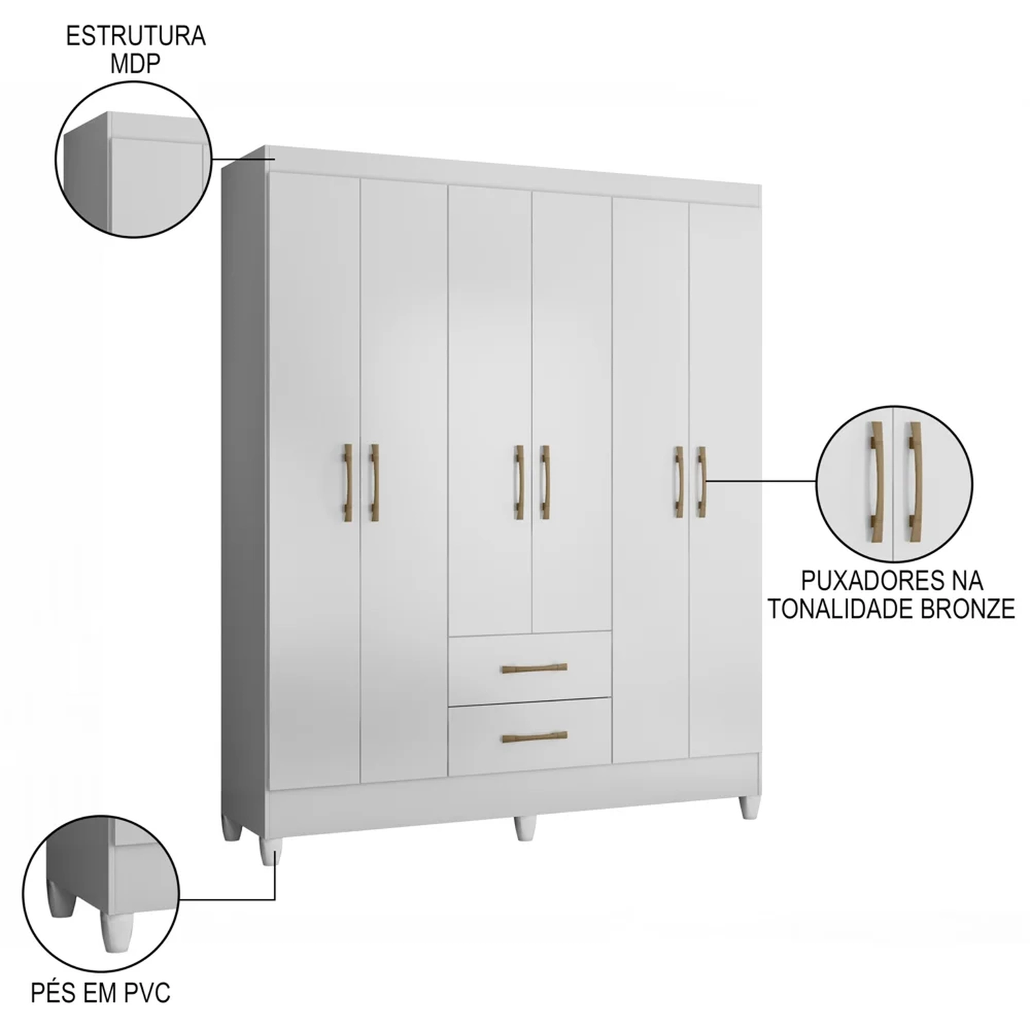 Desenvolvido na medida da sua necessidade, o Guarda Roupa Casal 6 Portas 2 Gavetas 153cm Paraná Z17 Branco, da Mpozenato, é a opção certa para você que quer um guarda roupa casal pequeno, mas sem abrir da funcionalidade.