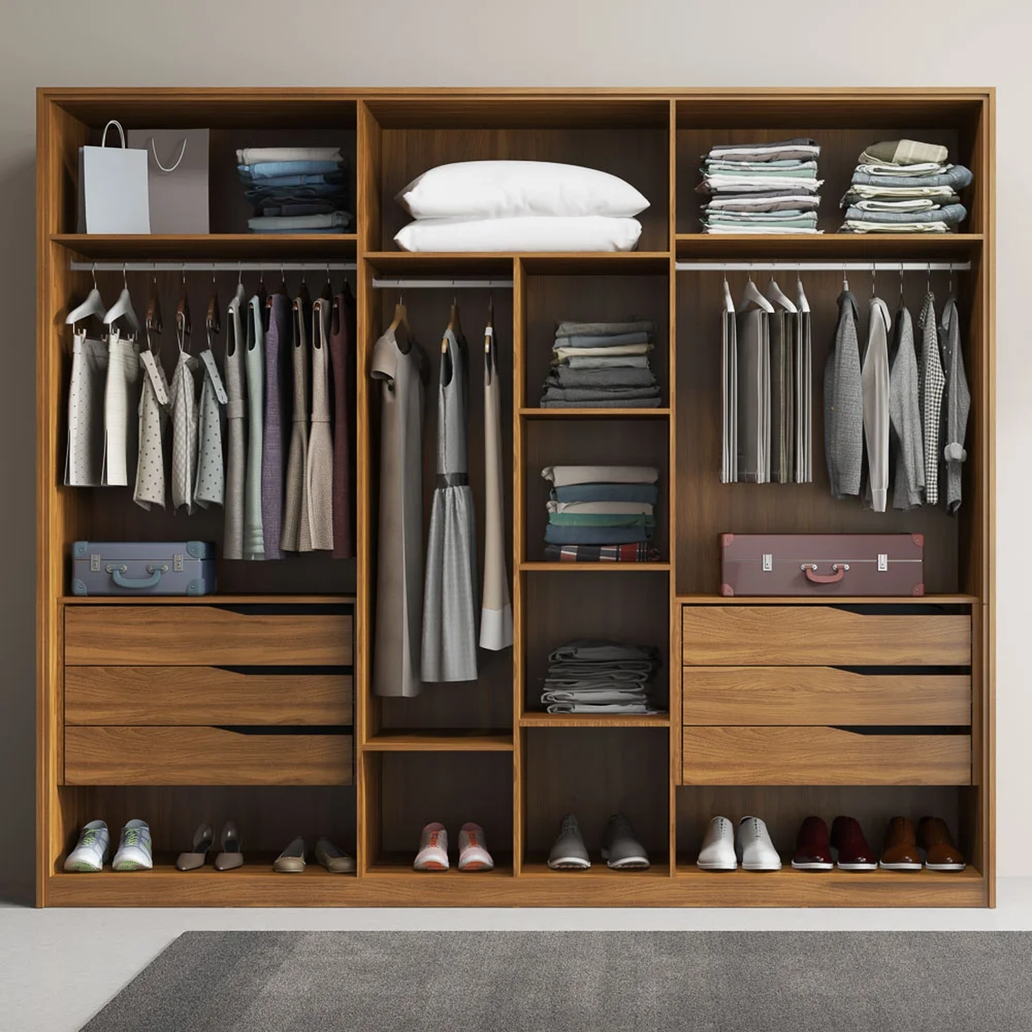 Perfeito para decorar seu dormitório, o Guarda Roupa Atrice vem com amplo espaço interno devido as repartições serem bem distribuídas, esse roupeiro conta com 6 gavetas, 3 cabideiros. 4 prateleiras, lugares para organizar seus sapatos e um grande maleiro para deixar os enxovais arrumados e também 6 portas com abertura convencional facilitando o dia a dia.