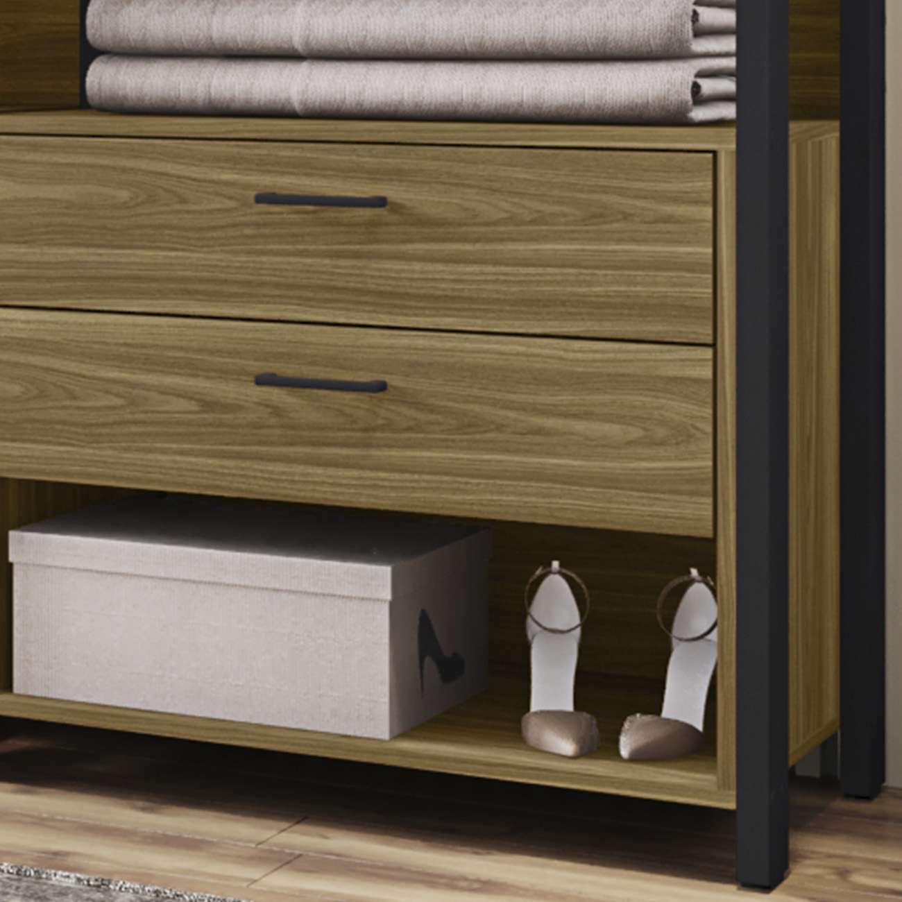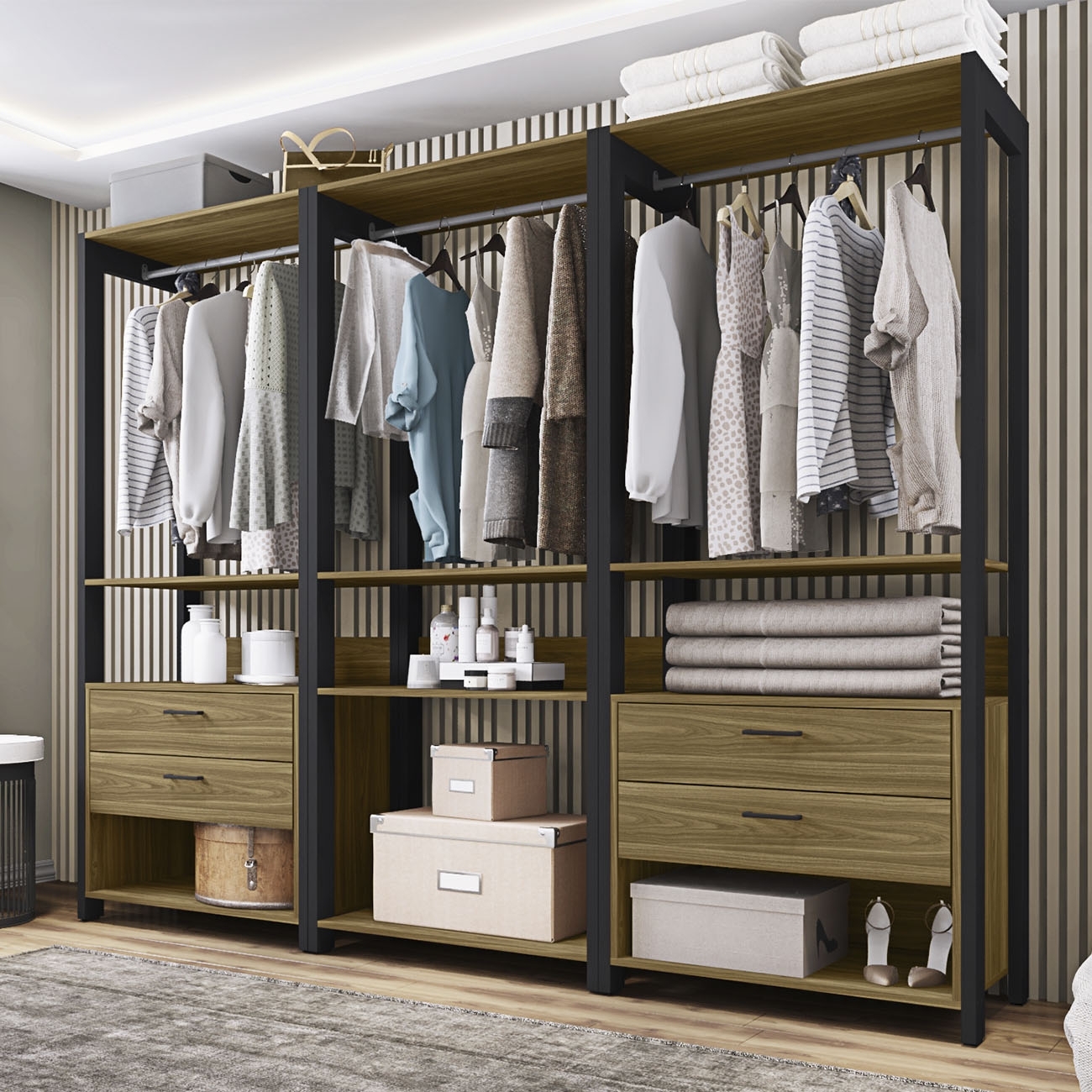 Possui três cabideiros em alumínio, seis prateleiras bem distribuídas para acomodar toalhas, caixas ou objetos decorativos. As quatro gavetas com corrediças telescópicas deslizam suavemente, perfeitas para manter tudo no lugar.