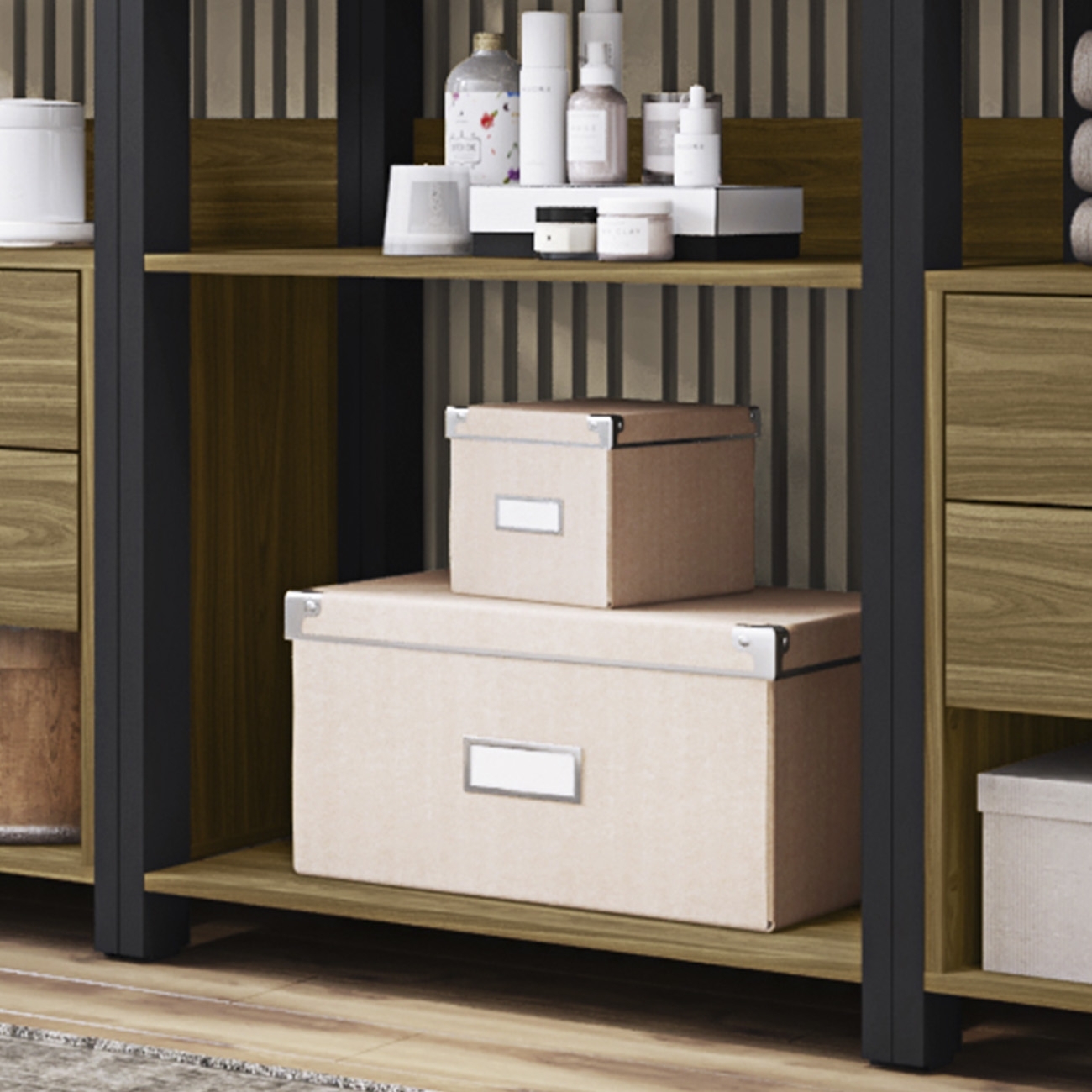 Nos nichos inferiores, você pode guardar sapatos, cestos ou o que mais precisar. O closet é aberto, sem portas e sem fundo, proporcionando leveza visual e facilitando o acesso diário.