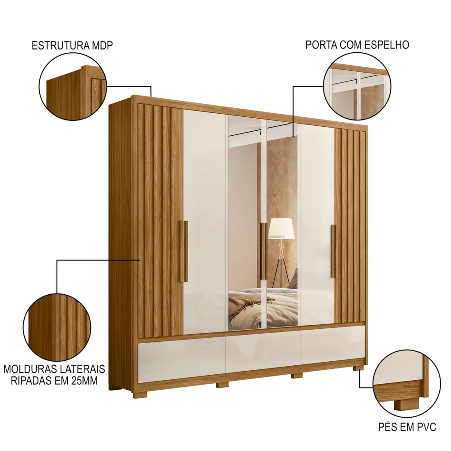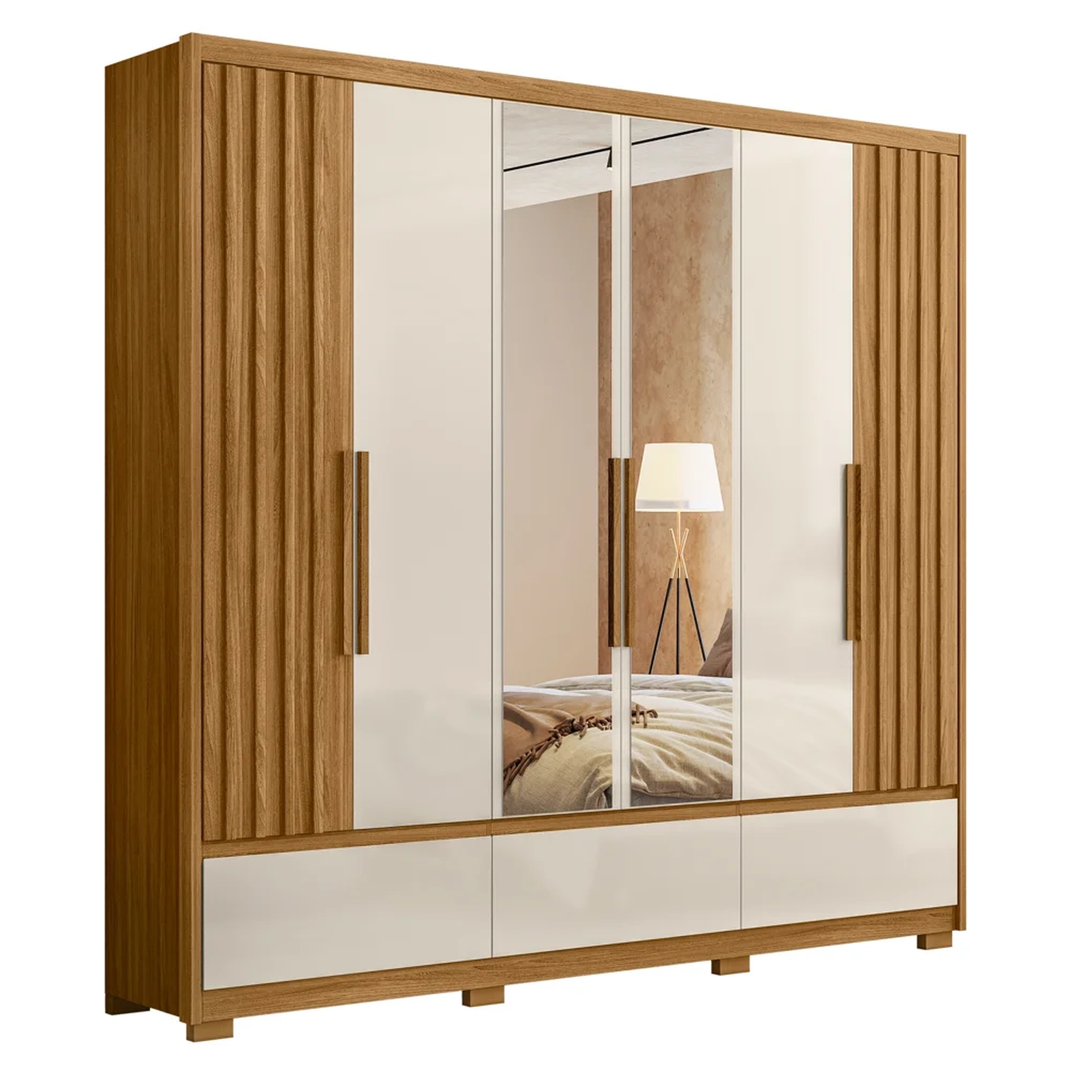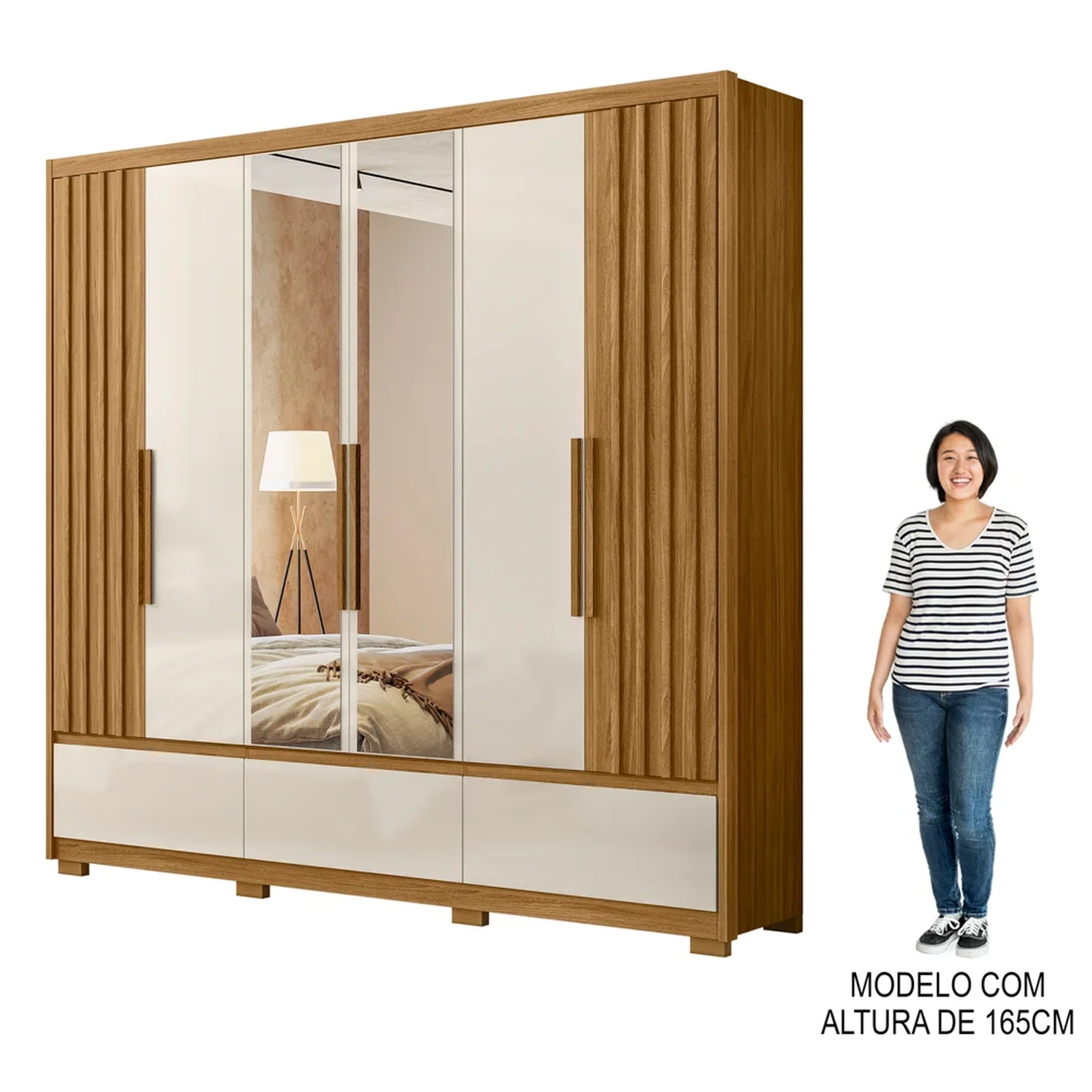 Para completar, o design das duas portas ripadas proporciona um toque moderno, além de ter 3 opções de montagem, ou seja, você pode deixar as portas ripadas nas laterais, no centro ou intercaladas, de acordo com o seu gosto. Em outras palavras, esse guarda roupa casal é perfeito para complementar a decoração do seu quarto, além de oferecer organização e estilo para quem busca praticidade e beleza em um só produto.