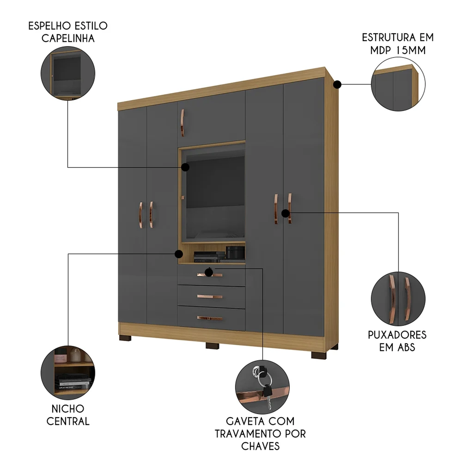 Com excelente repartição interna, esse guarda roupa com espelho conta com diversas prateleiras com amplo espaço, de modo que você poderá manter todas as roupas e itens pessoais bem distribuídos, assim, a hora de sair será bem mais prática; afinal, você encontrará com facilidade o look que procura. Além disso, o charme desse roupeiro casal está na parte central, na porta com espelho, que quando aberta revela os nichos internos para dispor produtos de cuidados pessoais, maquiagem, perfumes e por aí vai. Ah, e o espelho, além de ajudar na conferência do visual antes de sair, ainda dá a sensação de amplitude do ambiente.