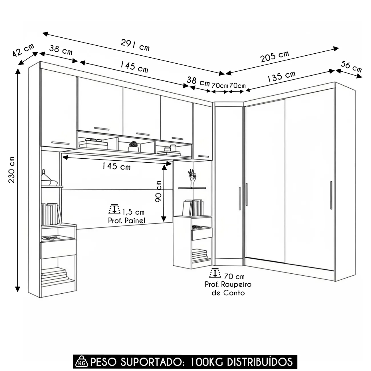 Peso Suportado Distribuído: Guarda Roupa 30Kg/Canto Oblíquo 25Kg/Mesa Cabeceira 15Kg cada/Armário Aéreo 15Kg.