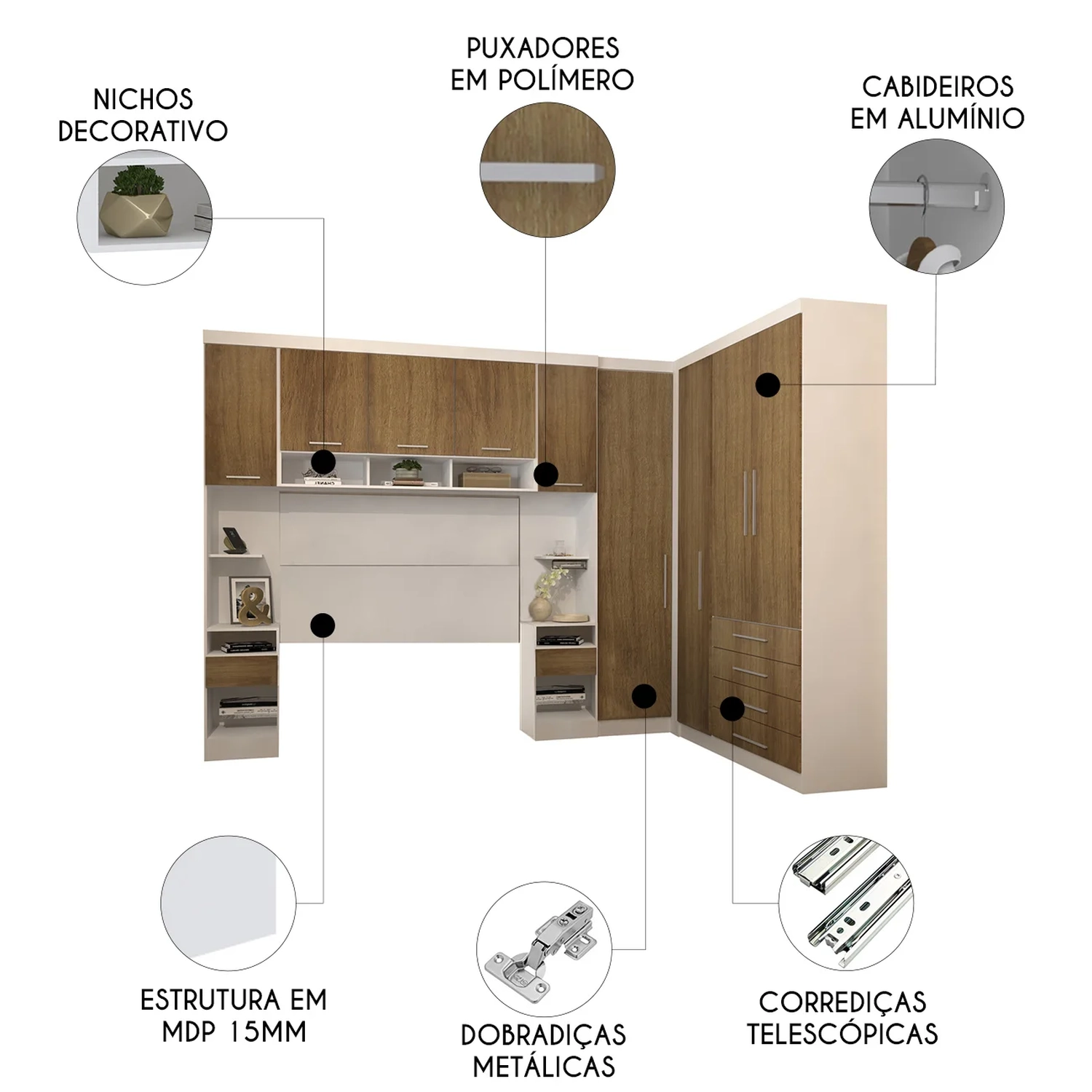 Conteúdo da Embalagem: 1 Guarda Roupa, 1 Canto Reto, 2 Mesas Cabeceira Alta, Sapateira, 1 Armário Aéreo, 2 Painéis Cabeceira.