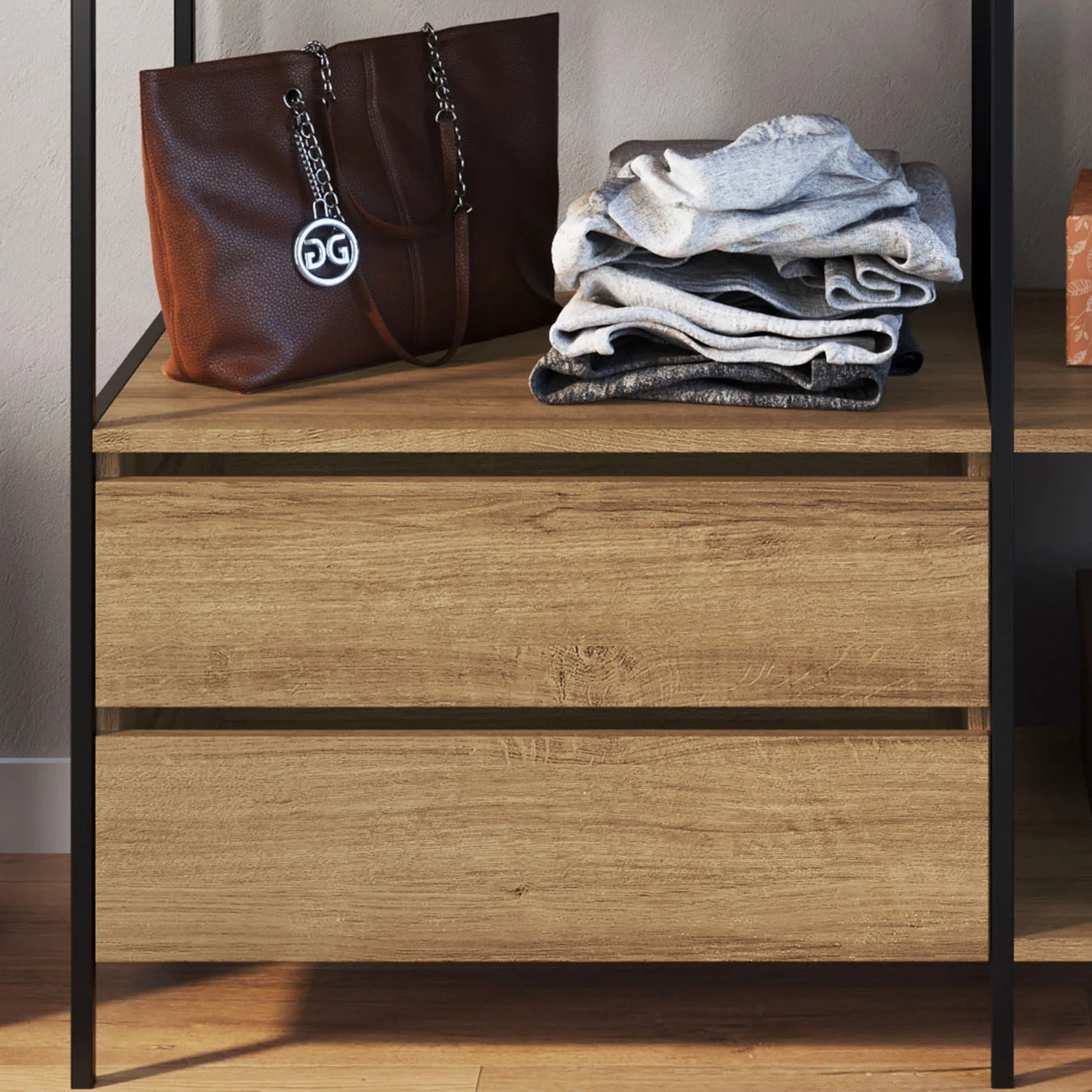 O Closet Industrial conta com duas gavetas com corrediças metálicas, prateleiras e um cabideiro em metal, oferecendo amplo espaço para guardar roupas, calçados e objetos diversos.