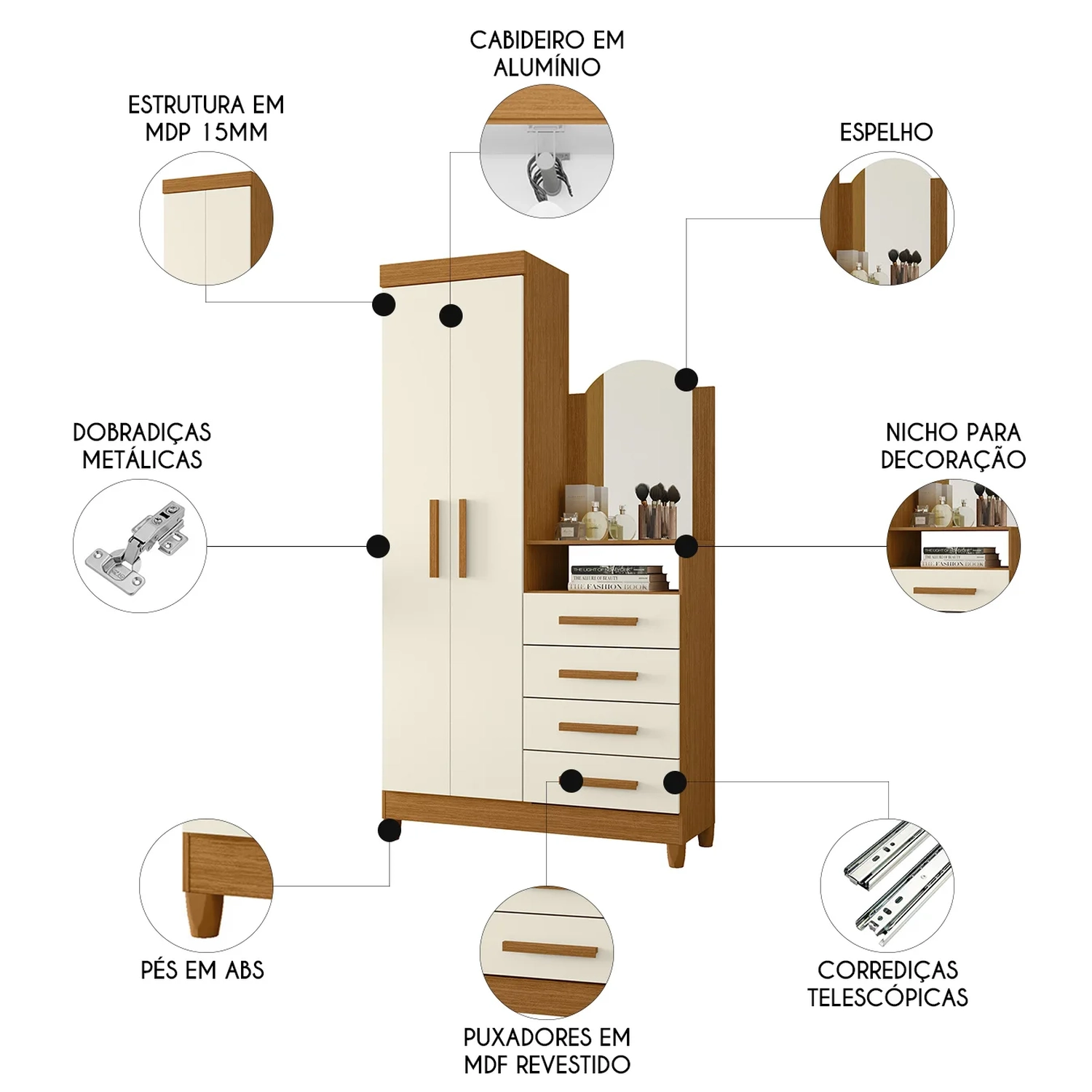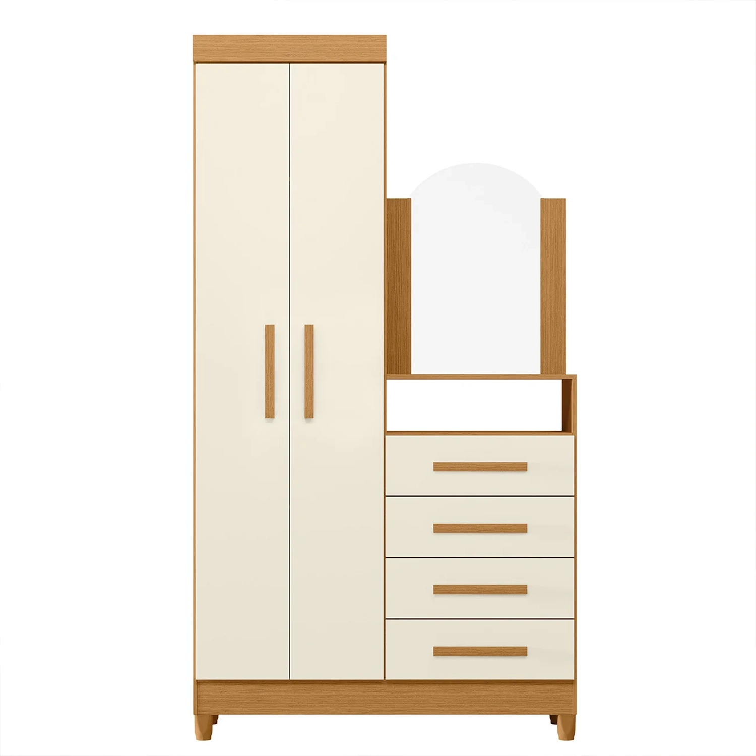 Sua estrutura é feita em MDP, com acabamento em pintura UV padrão, o que garante durabilidade e um visual sofisticado para o seu Quarto. As portas possuem dobradiças metálicas, oferecendo maior resistência ao uso diário, e os puxadores em MDF revestidos conferem um toque de elegância ao design. A Cômoda 4 Gavetas é equipada com corrediças telescópicas, proporcionando um deslizamento suave e eficiente para o armazenamento de roupas e acessórios. Além disso, a prateleira interna oferece mais opções de organização, deixando o guarda-roupa ainda mais funcional e versátil. O espelho curvo, é um excelente adicional que traz praticidade e um toque de estilo ao ambiente. O produto também acompanha pés em ABS, que facilitam a limpeza e garantem maior estabilidade ao móvel. Com todos esses recursos, o Guarda Roupa com Cômoda oferece o equilíbrio perfeito entre qualidade, organização e sofisticação, tornando-se a escolha ideal para quem deseja um ambiente bem organizado e cheio de estilo.