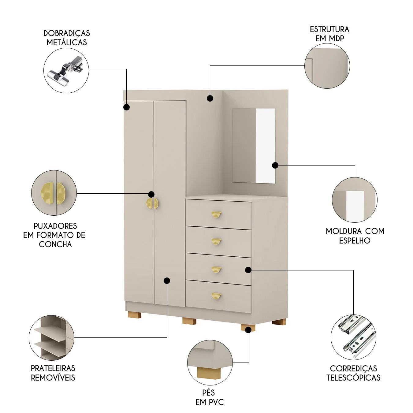 Guarda Roupa Cômoda Com Espelho 120cm Cristal Fendi - Vila Rica