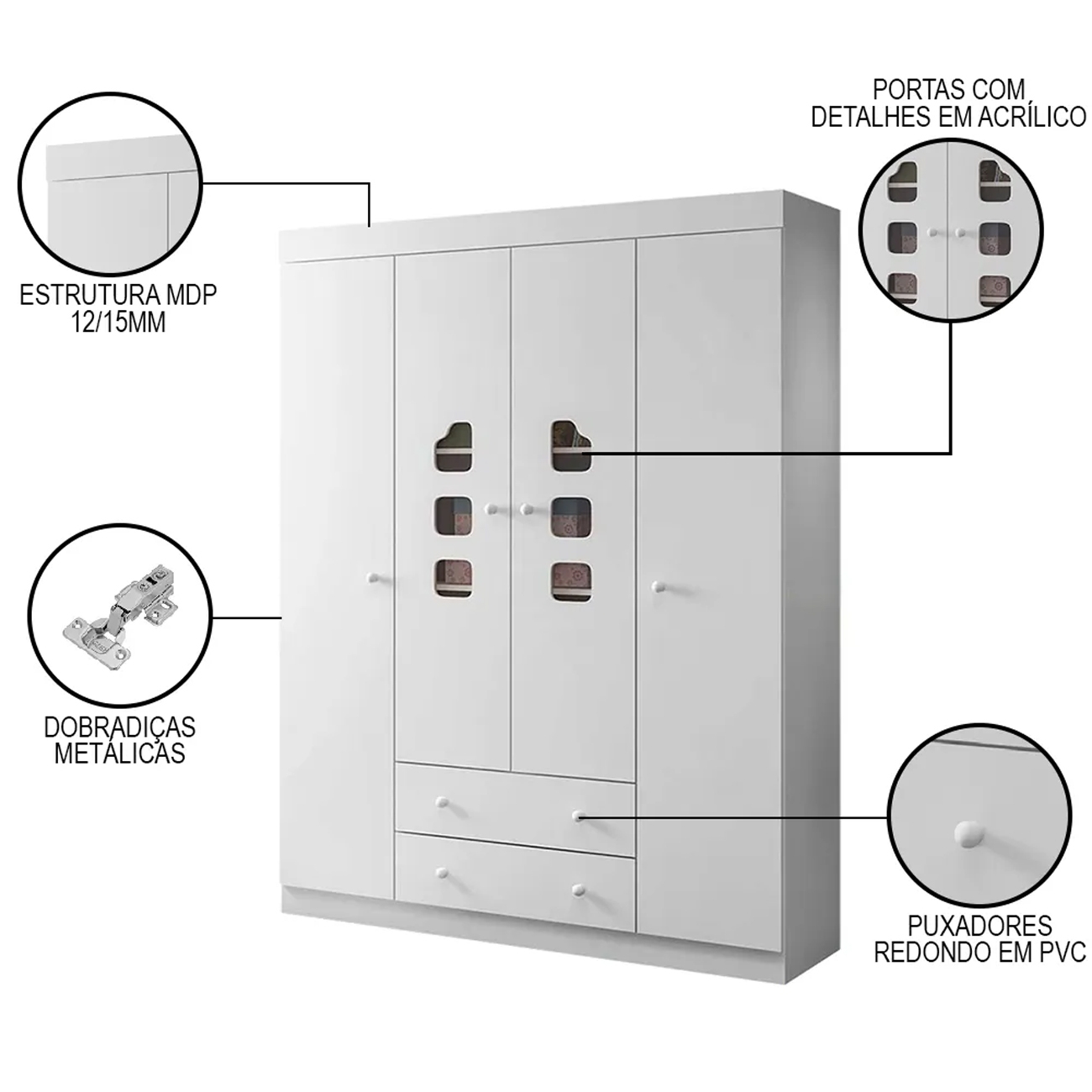 Se você está buscando um guarda roupa que seja bonito, funcional e durável, você vai se encantar com o Guarda Roupa Infantil 04 Portas 100% MDF Livia Branco, Phoenix Baby.