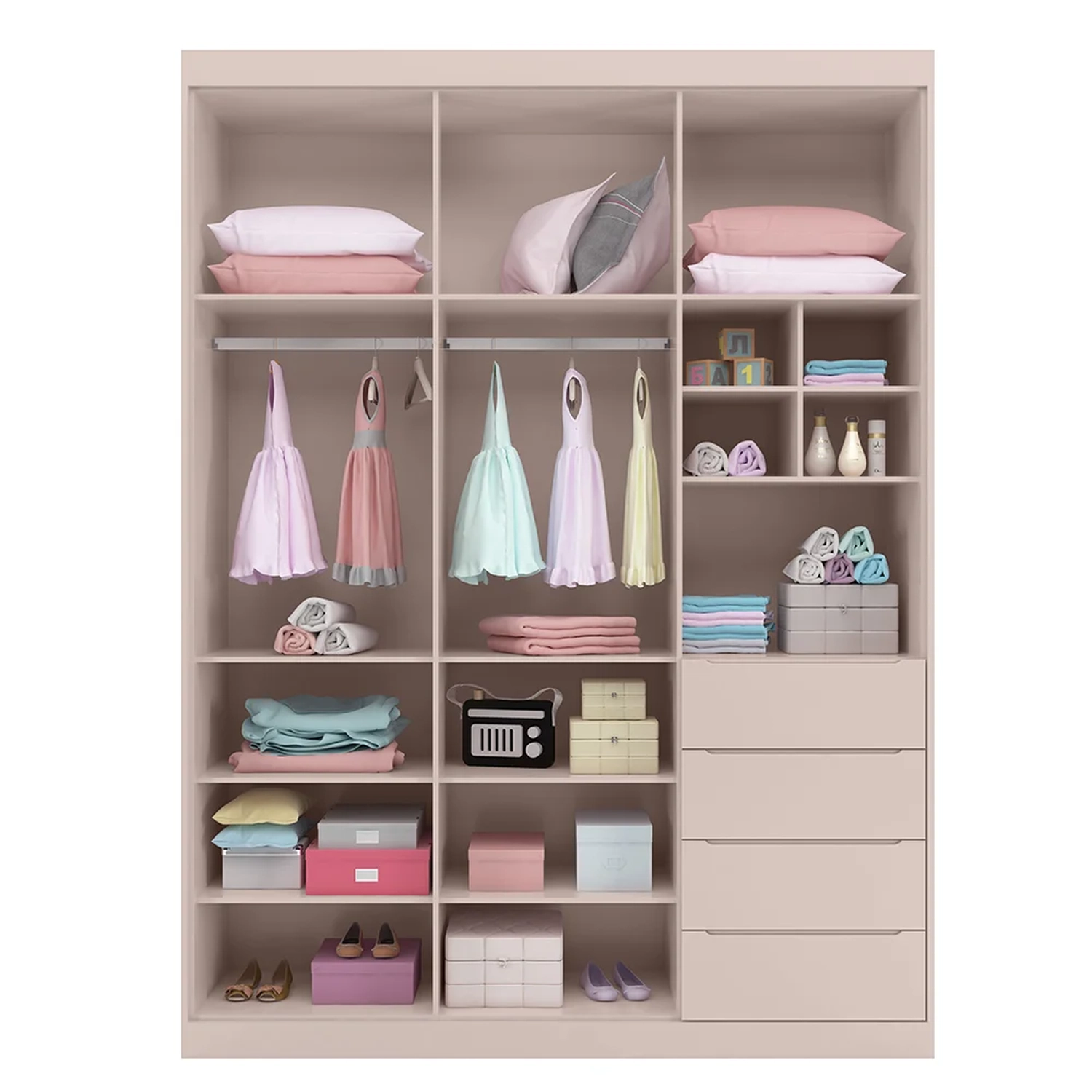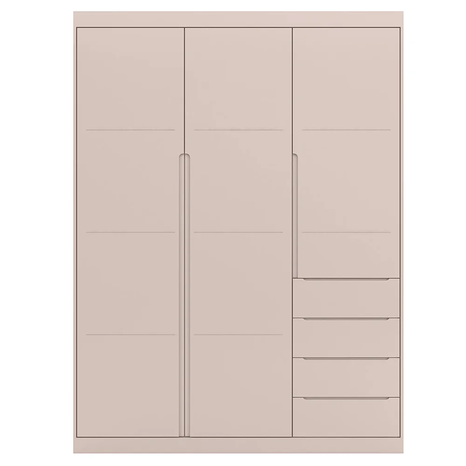 Este roupeiro conta com 3 portas, 4 gavetas com corrediças telescópicas que deslizam suavemente, 2 cabideiros metálicos, puxadores em cava, nichos e prateleiras. Além disso, é produzido 100% em MDF com chapa de 15mm e acabamento em pintura Uv acetinada atóxica, garantindo segurança, resistência e durabilidade ao móvel.
