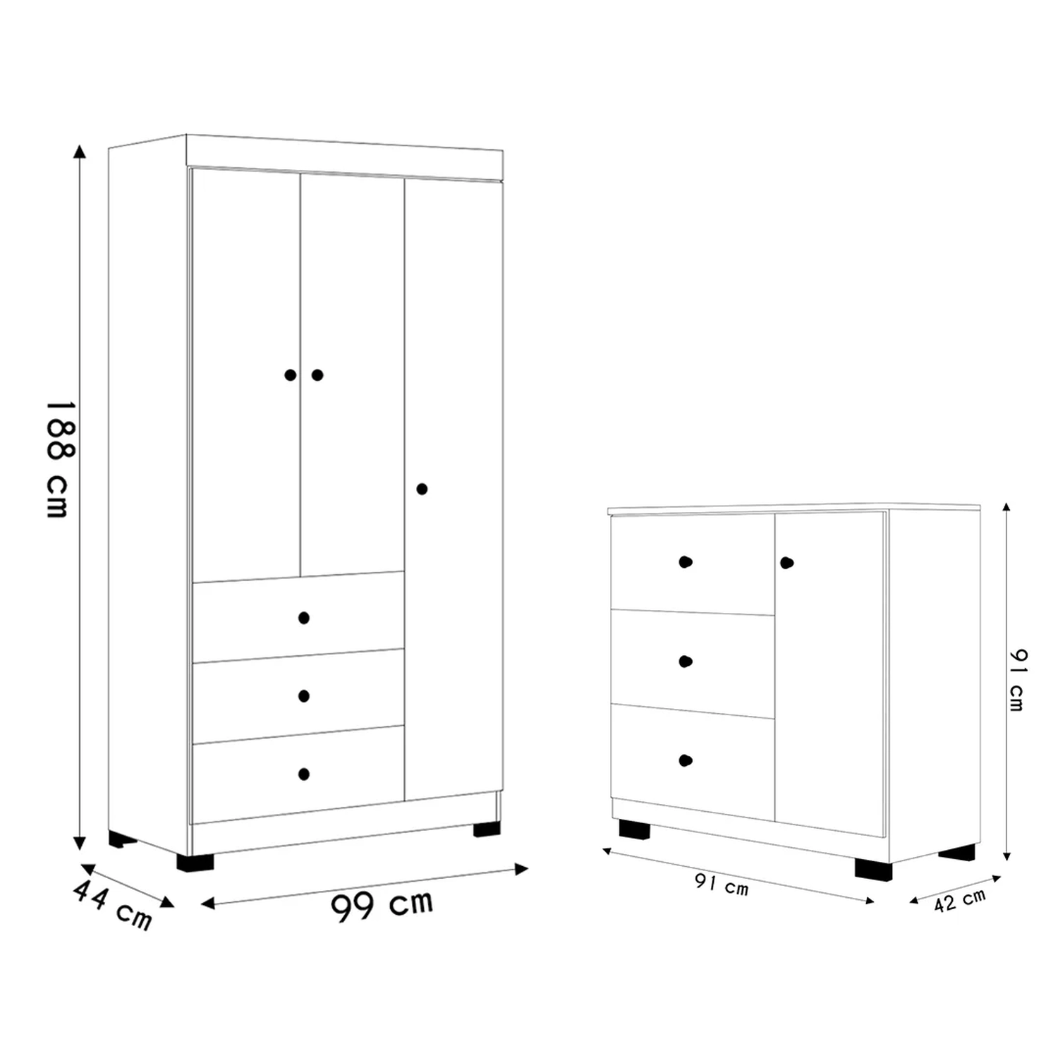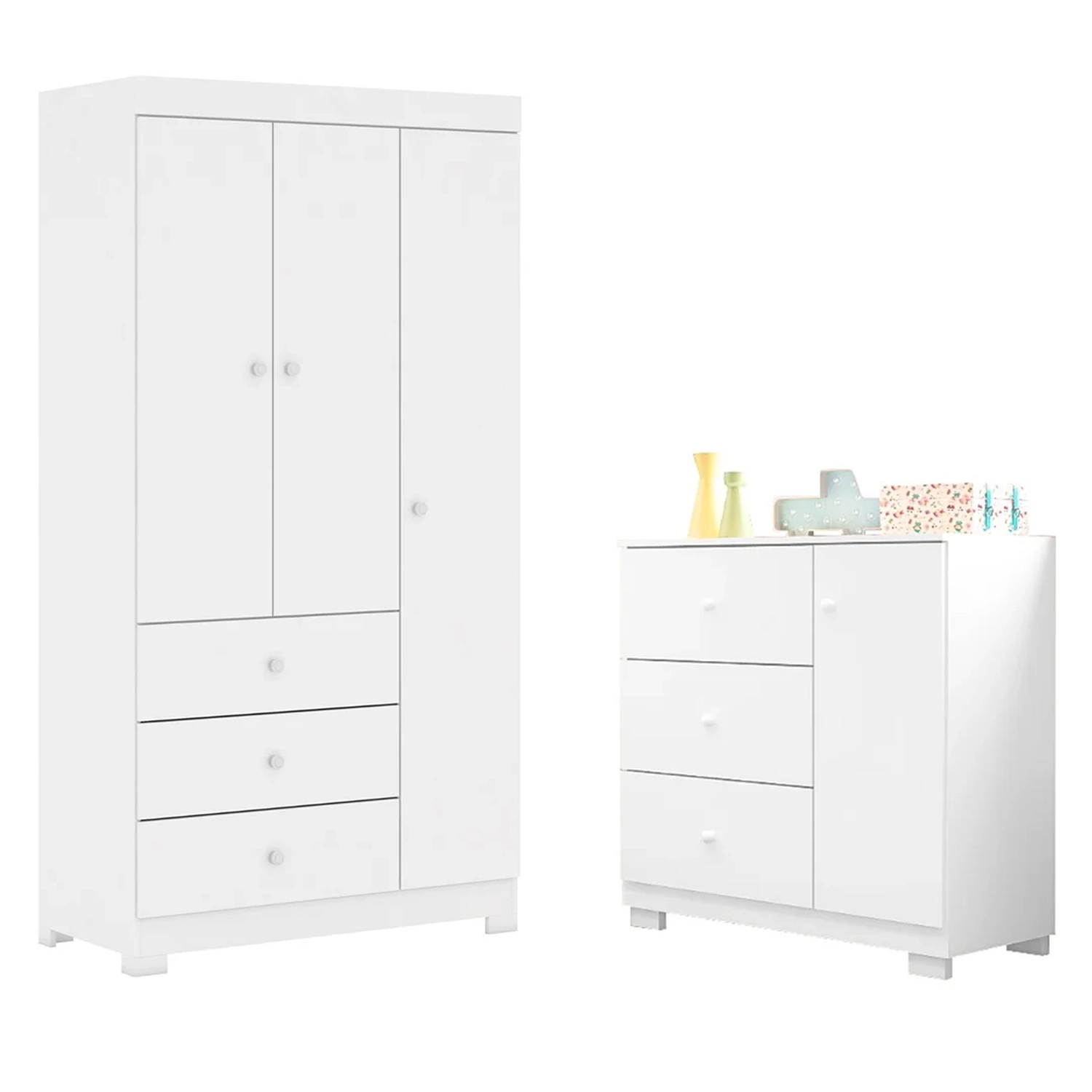 O conjunto Guarda Roupa Infantil 3 Portas Cômoda 3 Gavetas Duda Branco da Phoenix Baby é uma junção versátil e elegante.