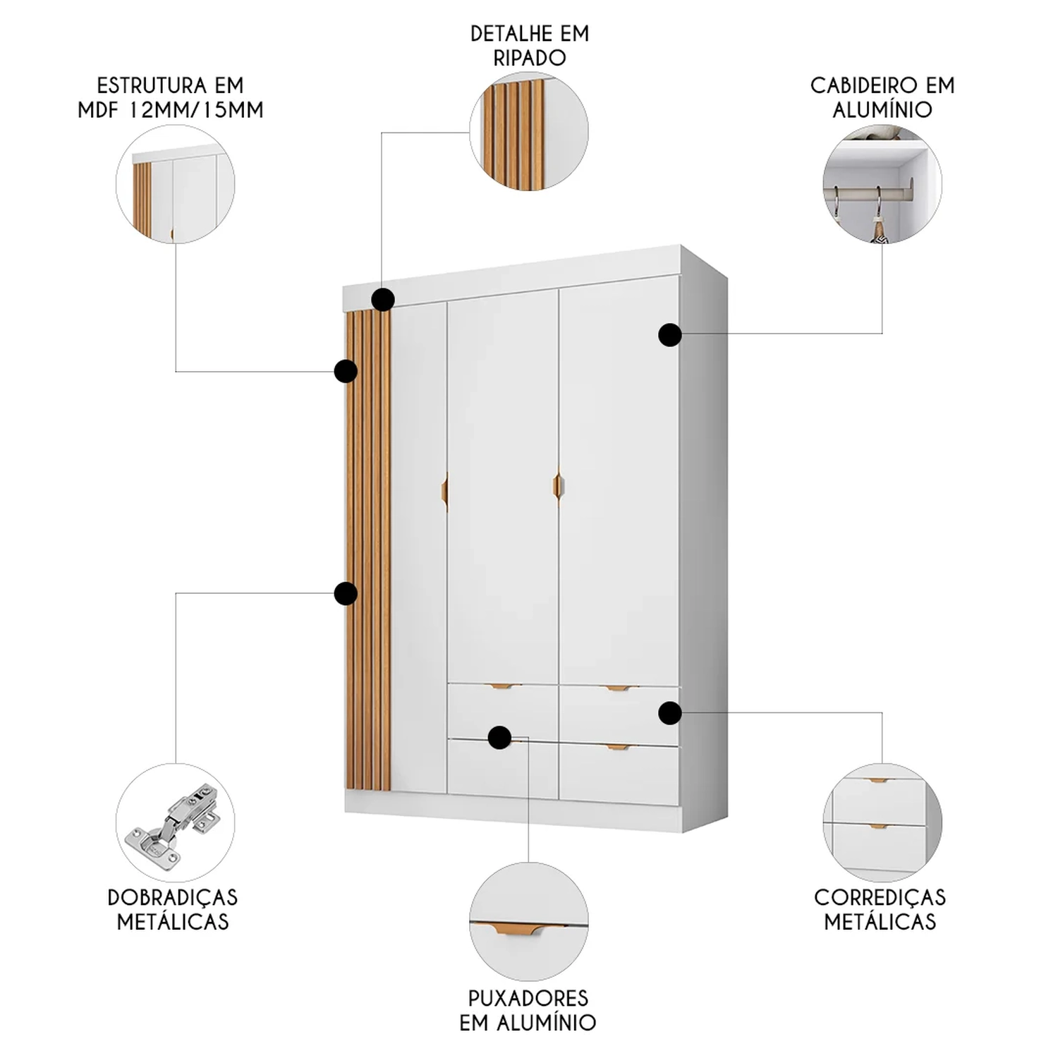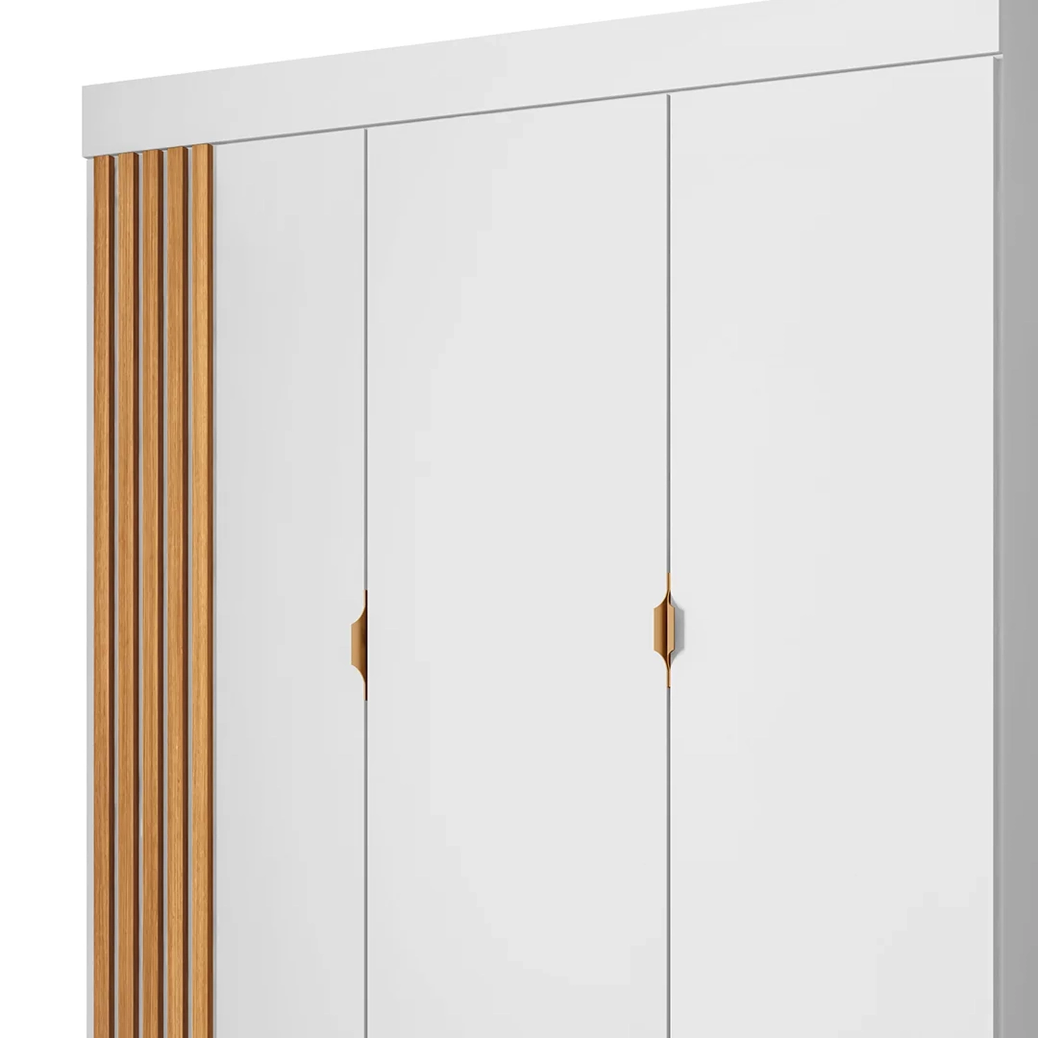 Com um design encantador, este móvel não só é esteticamente agradável, mas também funcional, graças às suas 4 gavetas com corrediças telescópicas que garantem um deslizamento suave e 3 portas com dobradiças metálicas. Com os puxadores de alumínio na cor cobre adicionam um charme especial ao Guarda Roupa, enquanto o acabamento em pintura UV assegura a durabilidade e realça a beleza. A estrutura em 100% MDF proporciona durabilidade ao móvel. Além do espaço interno com um cabideiro de alumínio e 4 prateleiras, além de um maleiro, oferecendo uma organização eficiente para as roupas e acessórios das crianças. O design moderno e sofisticado se harmoniza com diversos estilos de decoração, tornando-o versátil. Com todas essas características, o Guarda Roupa Ripado é uma adição valiosa para criar um ambiente acolhedor e bem organizado para os pequenos.