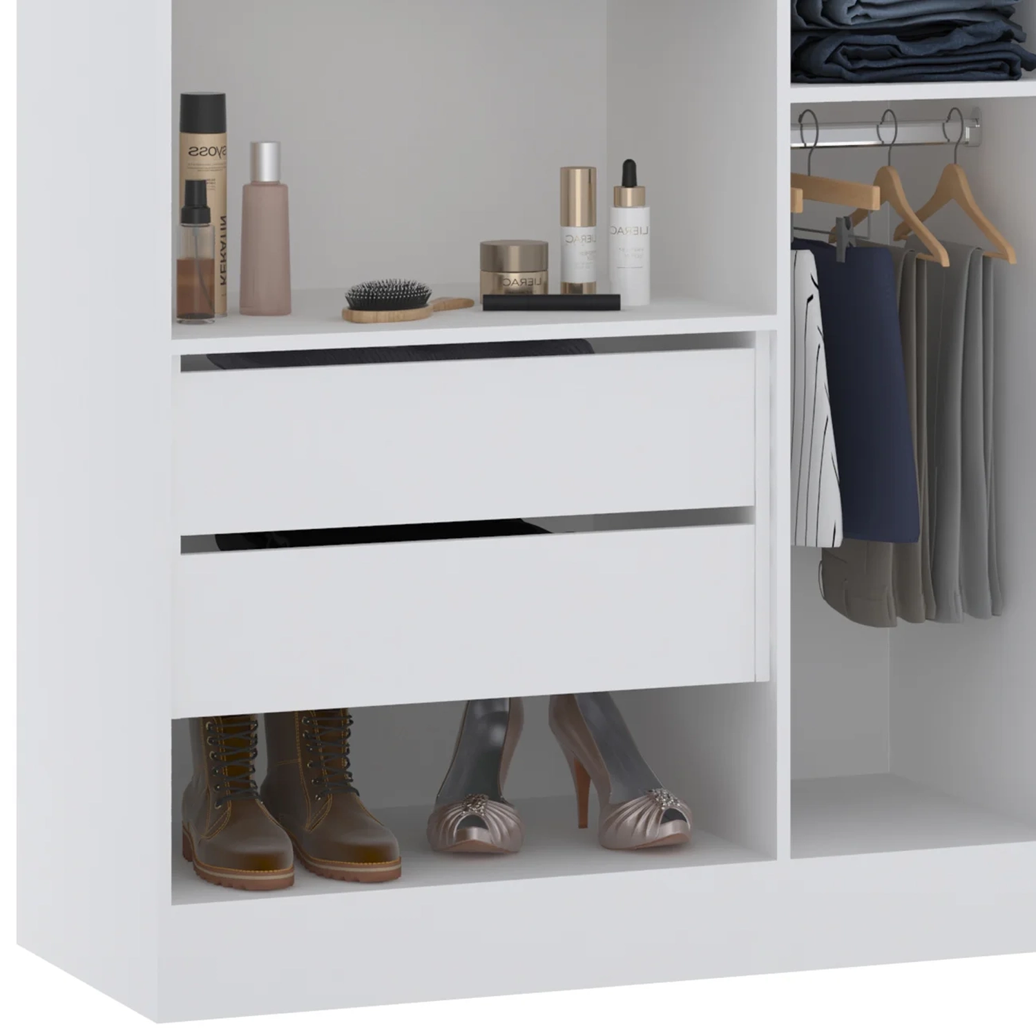 Além disso, conta com duas prateleiras menores e dois cabideiros, tornando esse Roupeiro uma solução completa para organizar roupas e acessórios com praticidade e charme.