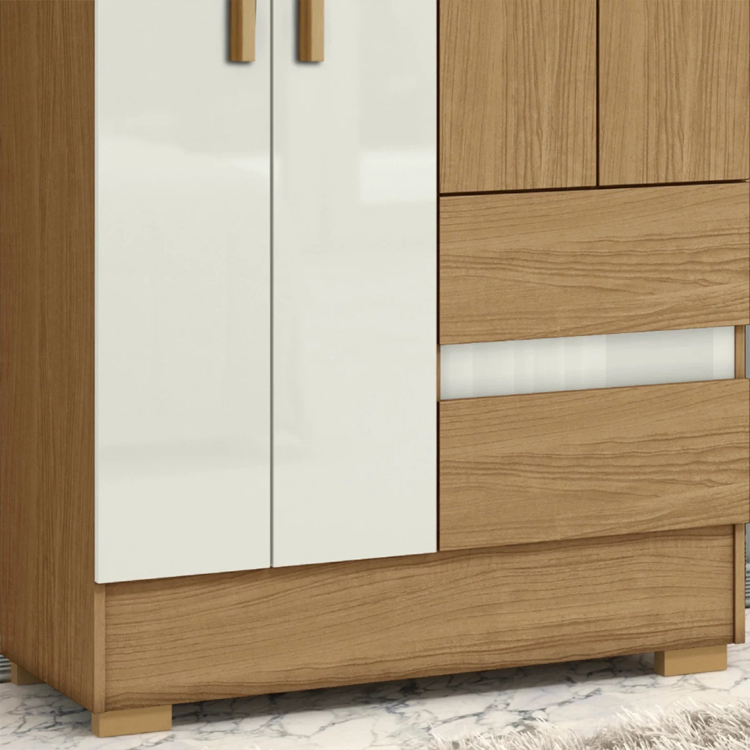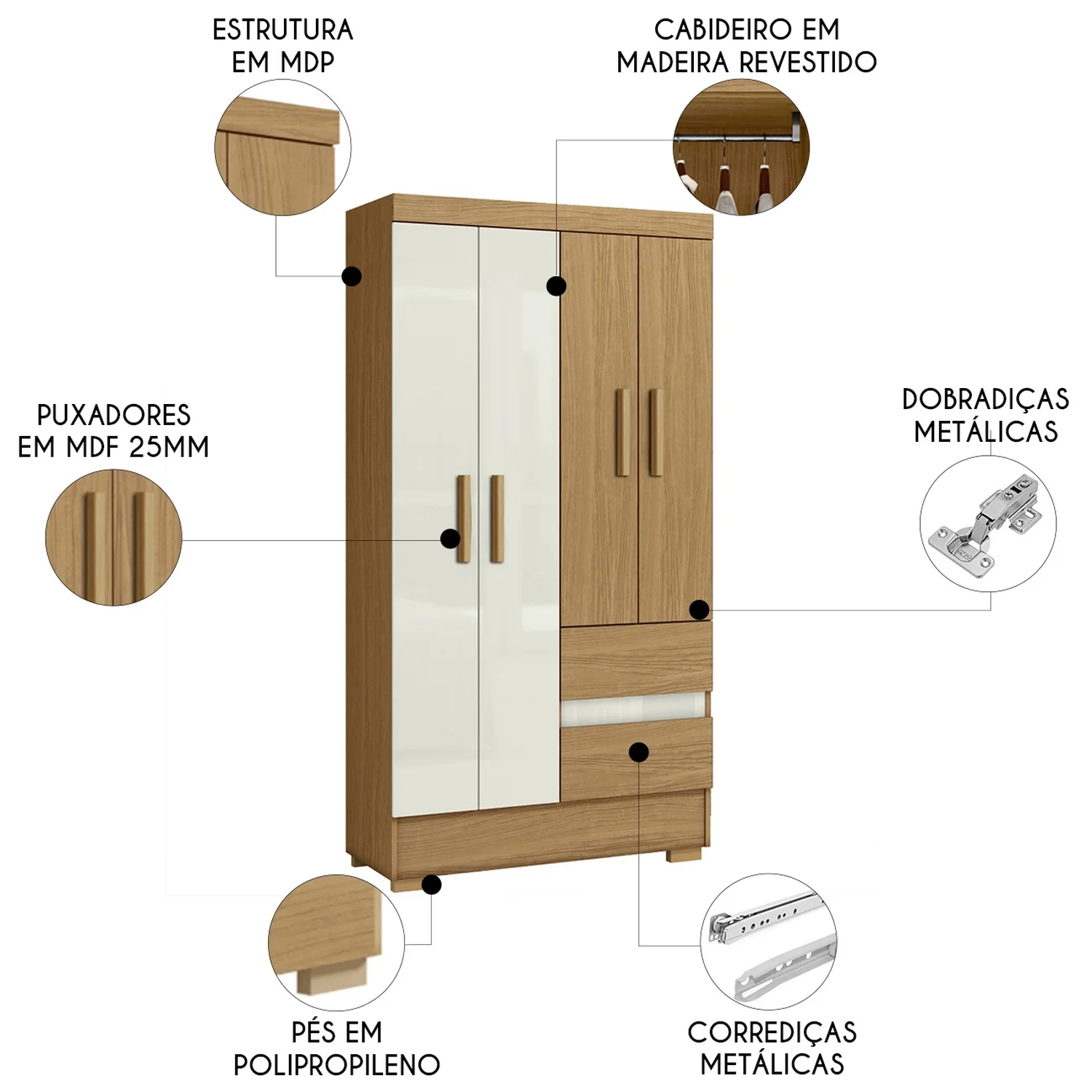 Pensado para durar, esse Guarda Roupa tem dobradiças metálicas nas quatro portas. Os pés em polipropileno e puxadores em MDF deixam o móvel mais leve e resistente ao uso diário.